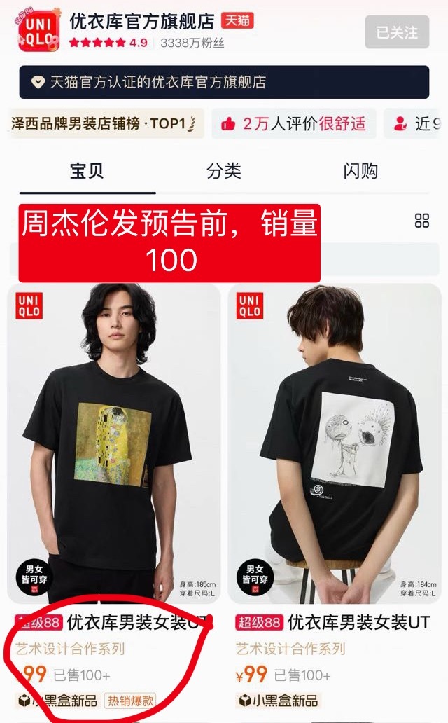 周杰伦发预告,最大赢家出现了,那就是优衣库,发预告之前就卖了一百件,现在光某bao就卖了六千件,直接快全型号断货了,其他平台和线下不知道还卖掉多少,接优衣库的好运,啥也不用做,莫名其妙就跟着火了一件爆款!