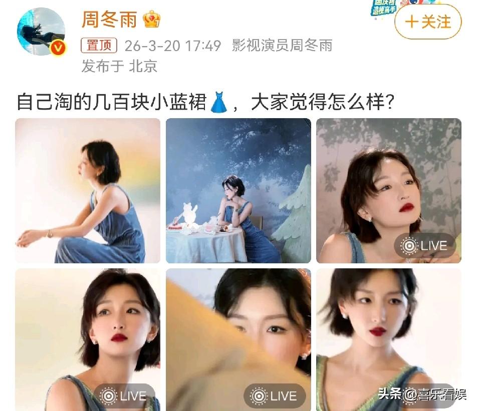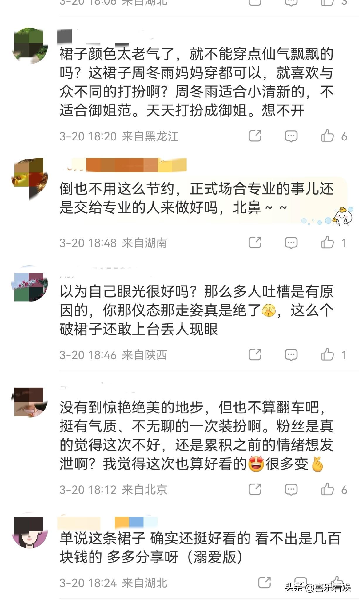 周冬雨,又被吐槽了 3月20日晚,周冬雨亮相CMG中国电影盛典,她穿了条自己淘的几百块蓝丝绒长裙走红毯,没想到却引来了粉丝网友的吐槽。 红毯上,周冬雨是利落的短发配红唇,穿着深V露背的丝绒裙,领口还带点细闪装饰,垂坠感拉满,走路的时候裙摆跟着晃,贵气里又透着点随性。 她踩着厚底高跟鞋,站在红毯上时,回头看镜头的样子,一点都不端着,完全是“我穿我喜欢”的松弛感。 令人没想到的是,看到周冬雨的这一身穿扮,有网友却吐槽说:“裙子颜色太老气了,就不能穿点仙气飘飘的吗?像妈妈辈穿的”。 还有人说:“倒也不用这么节约,正式场合专业的事儿还是交给专业的人来做好吗?”。 不过,也有理性的网友表示“虽然没到惊艳的地步,但也不算翻车,挺有气质的”。 其实换个角度想,明星也是普通人,能在这么正式的场合穿自己淘的平价裙,还敢主动晒出来问大家意见,这份坦然真的挺难得的。 说到底,穿什么不重要,自己舒服自在才是最好的,你们觉得呢?