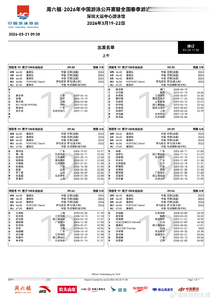 男子100米自由泳:潘展乐、王浩宇、赵家悦、刘昊狄、徐海博、何宇博、陈昊、托马斯-切孔、凯尔-查尔默斯、克利门特-科列斯尼科夫、杰克-阿莱克西、彼得-库切;
