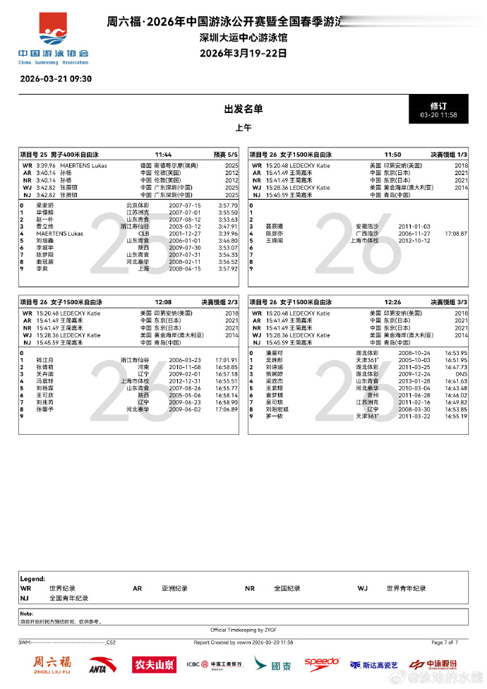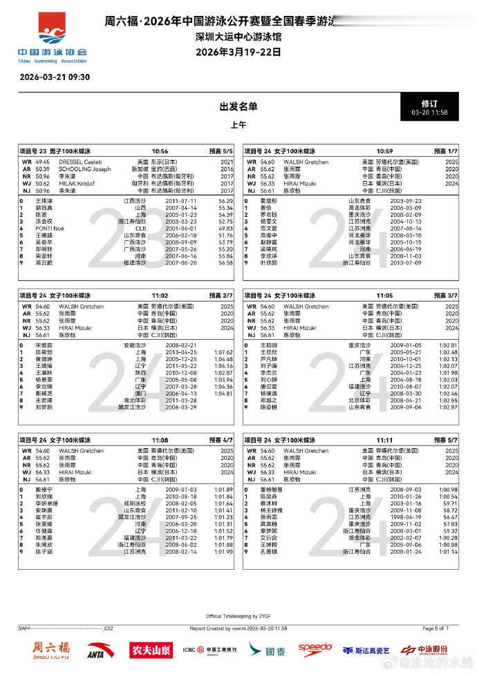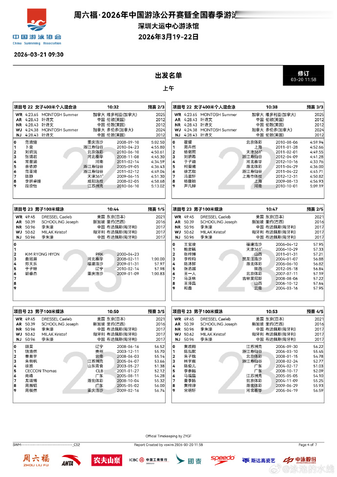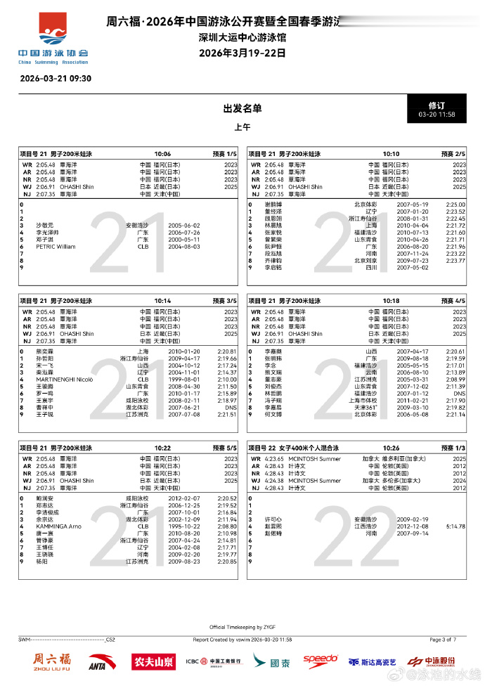 虎扑03月20日讯2026年中国游泳公开赛暨全国春季游泳锦标赛将于21日进行第三比赛日的争夺。