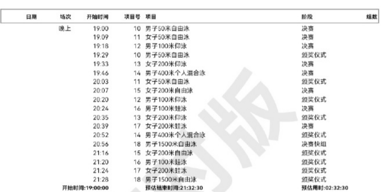 预赛项目在9点30分开始,本届比赛热度最高的项目之一男子100米自由泳将会在这一比赛日进行,杰克-亚历克西、凯尔-查尔莫斯、潘展乐和托马斯-切孔等名将将会展开一场较量,其中潘展乐与切孔被共同分在预赛第6组;