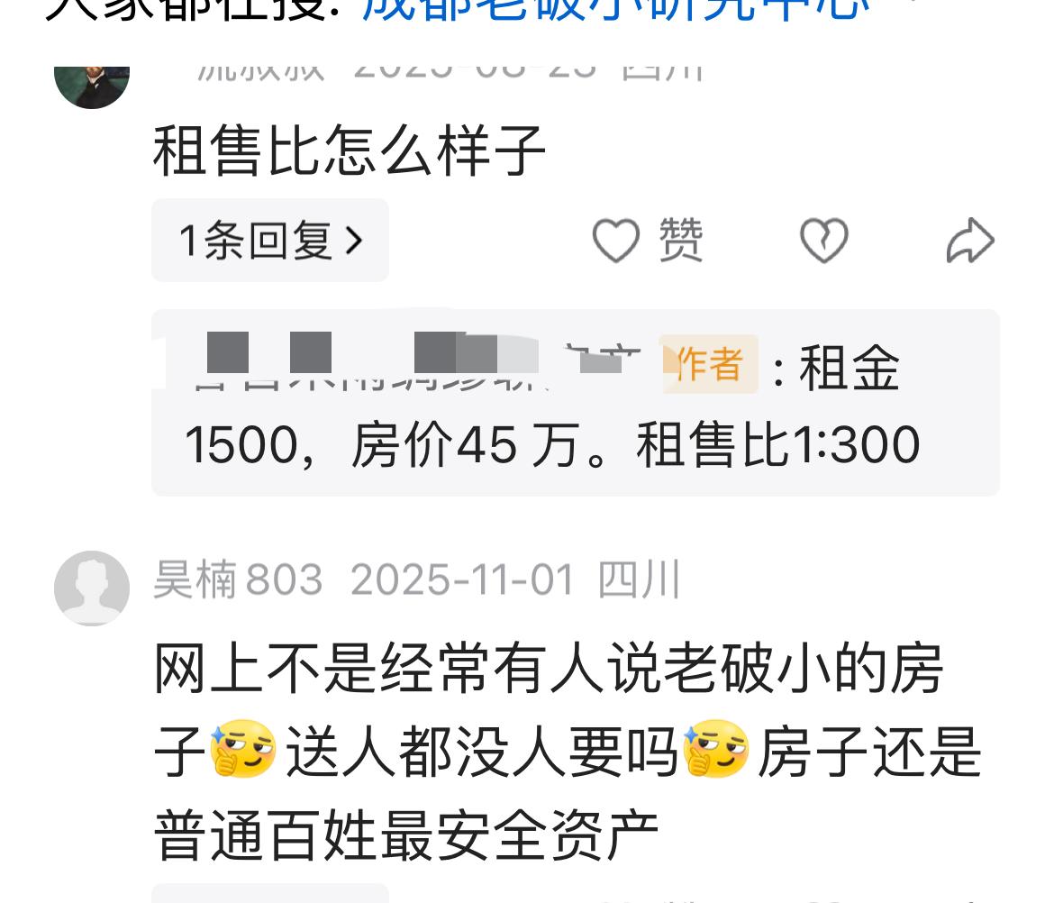 买老破小,发大财?成都某女士花330万买8套老破小,出租一个月2.1万,我们来算下! 成都一位房产从业者发文:花45万,买牛市口附近的老破小,54平方米,看均价应该是差不多的! 这个房子的租金是每月1500元。 如果就是这个价格买8套,总价在360万元,租金1.2万元!总价比330万高,而租金比2.1万低太多! 那么,这个事情是不是完全不可能,查询信息后,说在春熙路等商圈买老破小公寓(LOFT),大概可能实现!