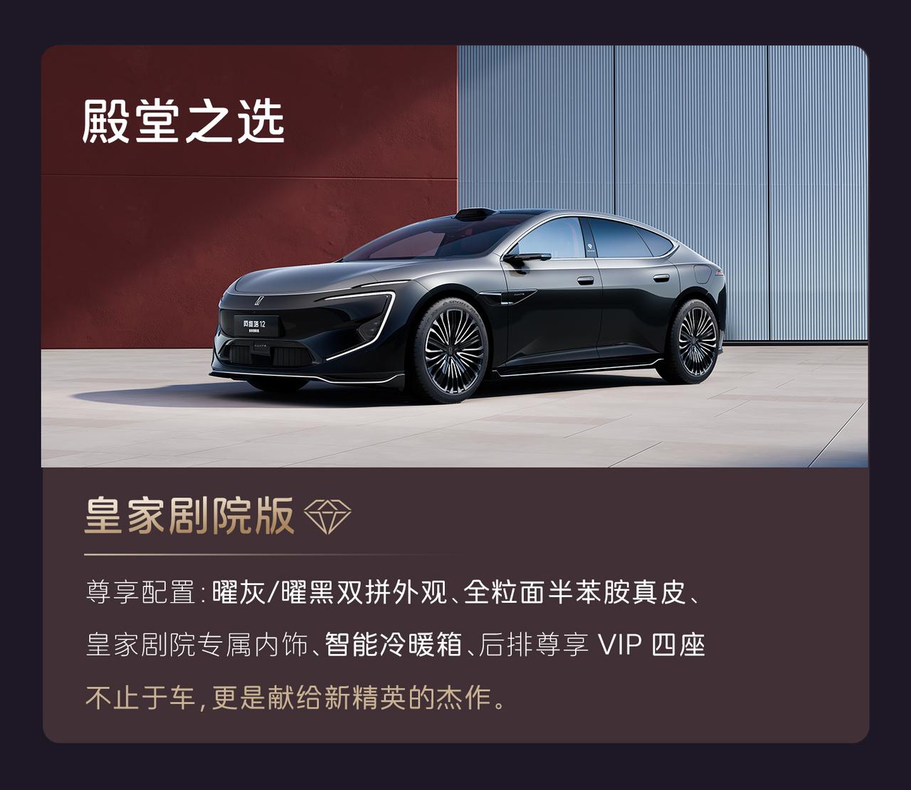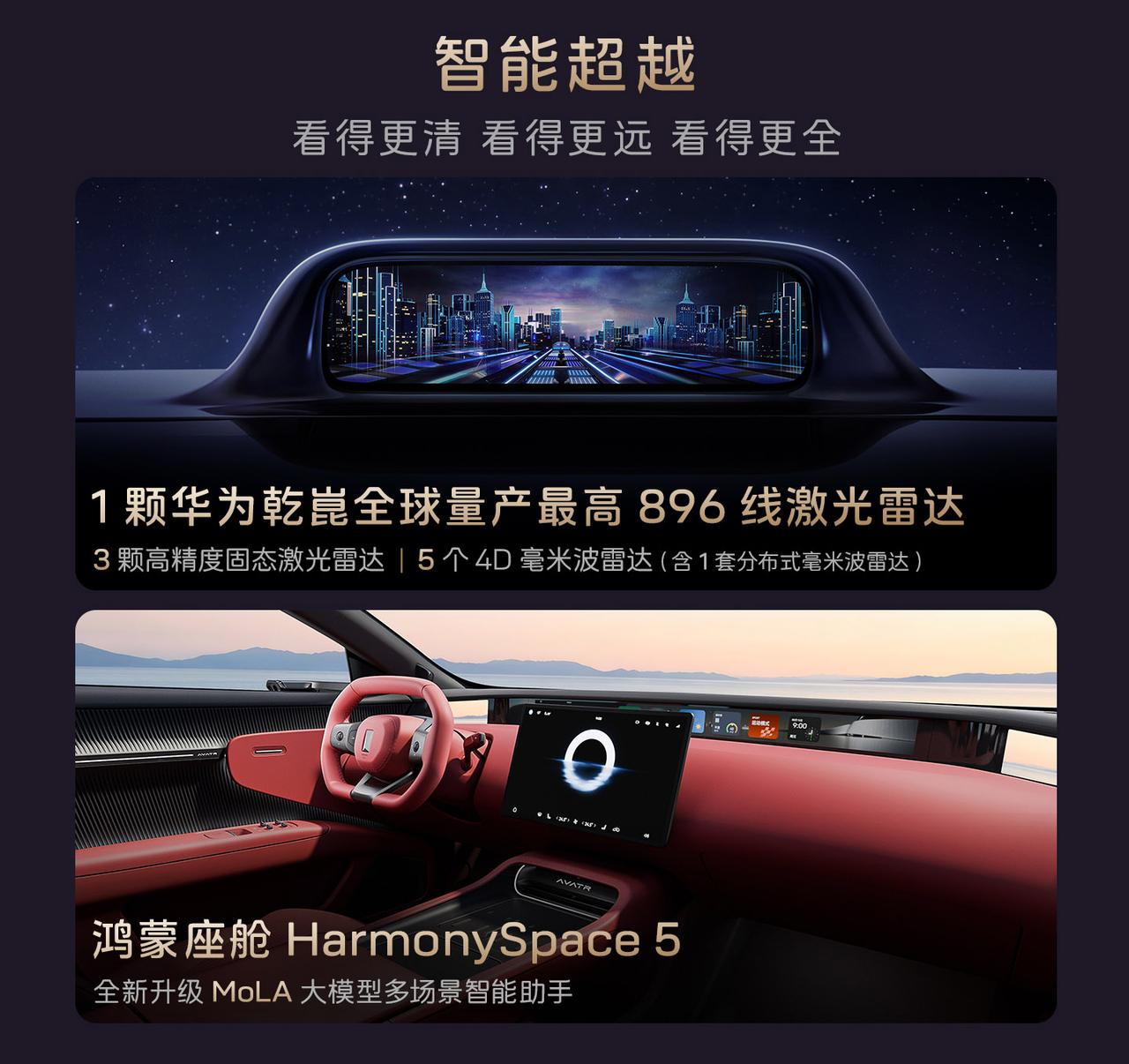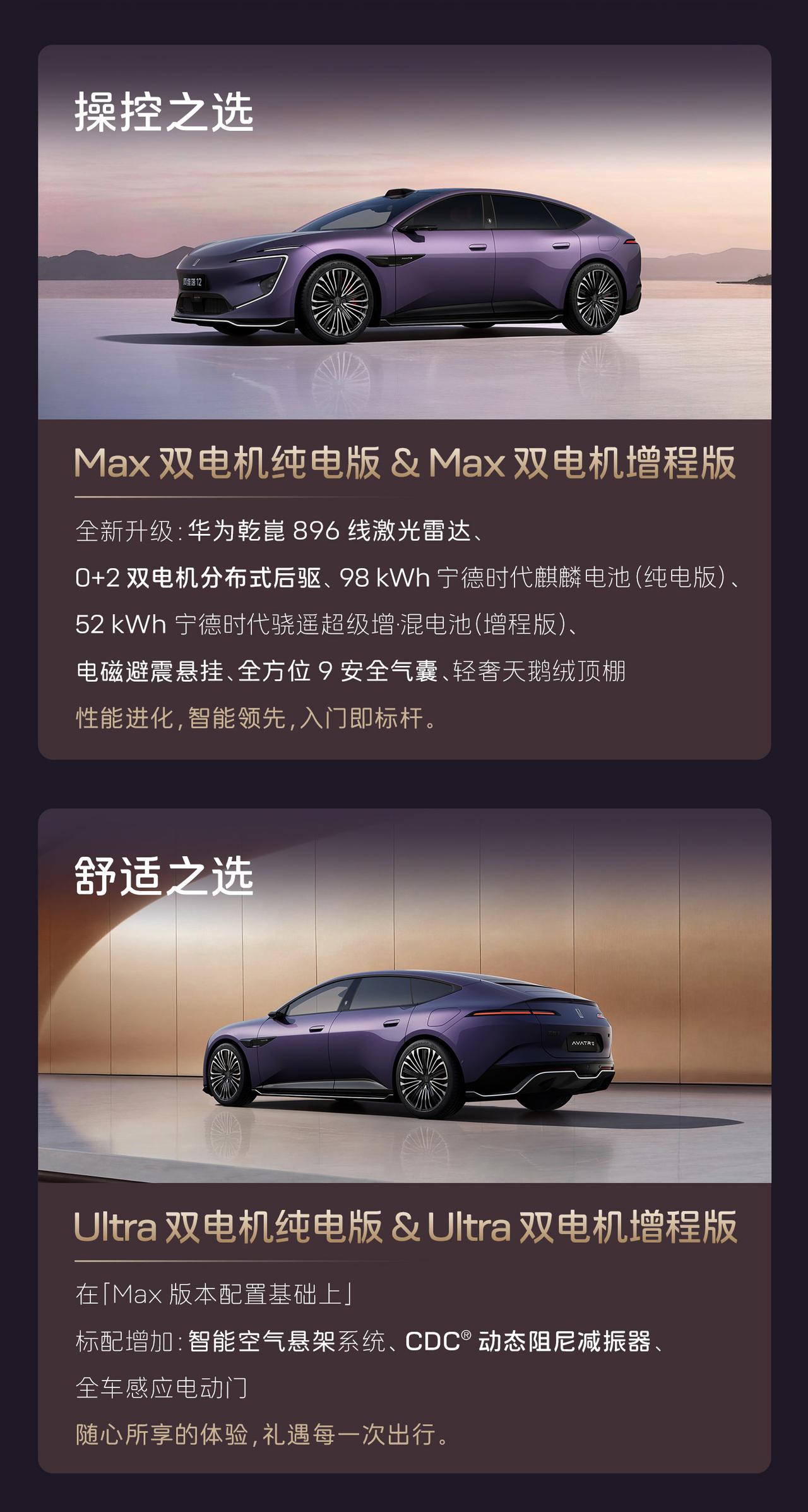 新阿维塔12正式开启预售,共推出7款车型,预售价29.99万起。 全系标配华为乾崑896线激光雷达(顶置+翼子板三激光布局),搭载华为乾崑ADS 4.0高阶智能驾驶系统。 动力方面搭载太行分布式电驱,三电机四驱版零百加速仅需2.71秒; 纯电版标配98度麒麟电池,增程版标配52度电池。 方向盘新增实体按键(一键语音、Boost加速); 门板优化应急拉手并新增开放式储物空间;车窗开关回归实体按键;顶棚升级天鹅绒材质。 搭载了电磁避震并且配备全维防碰撞系统CAS 4.0。【来自懂车帝车友圈】