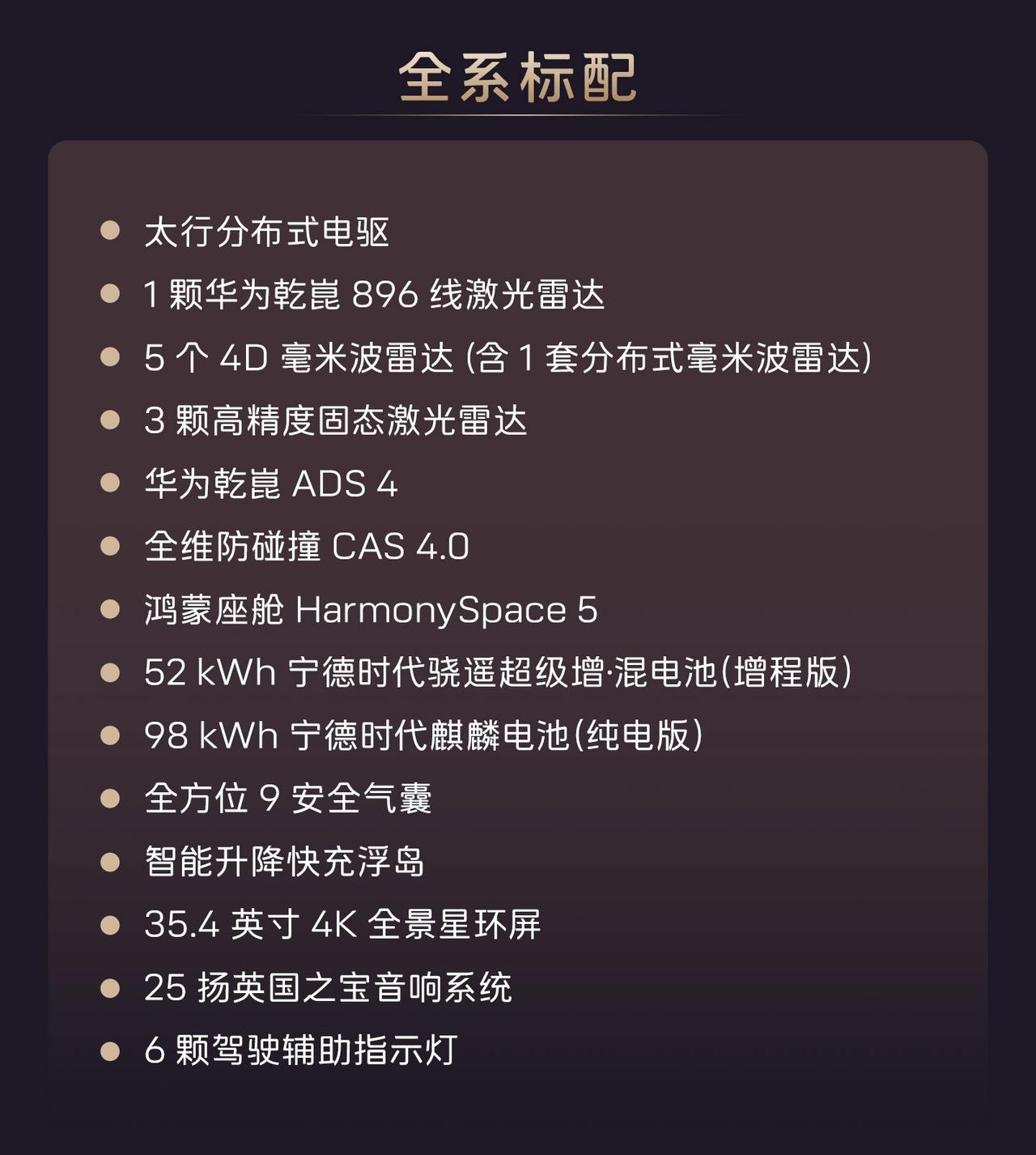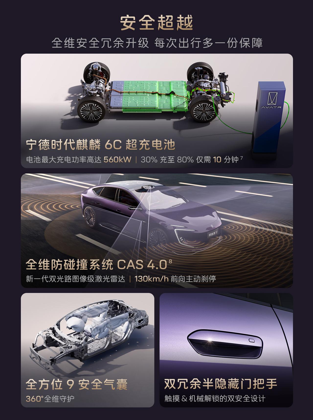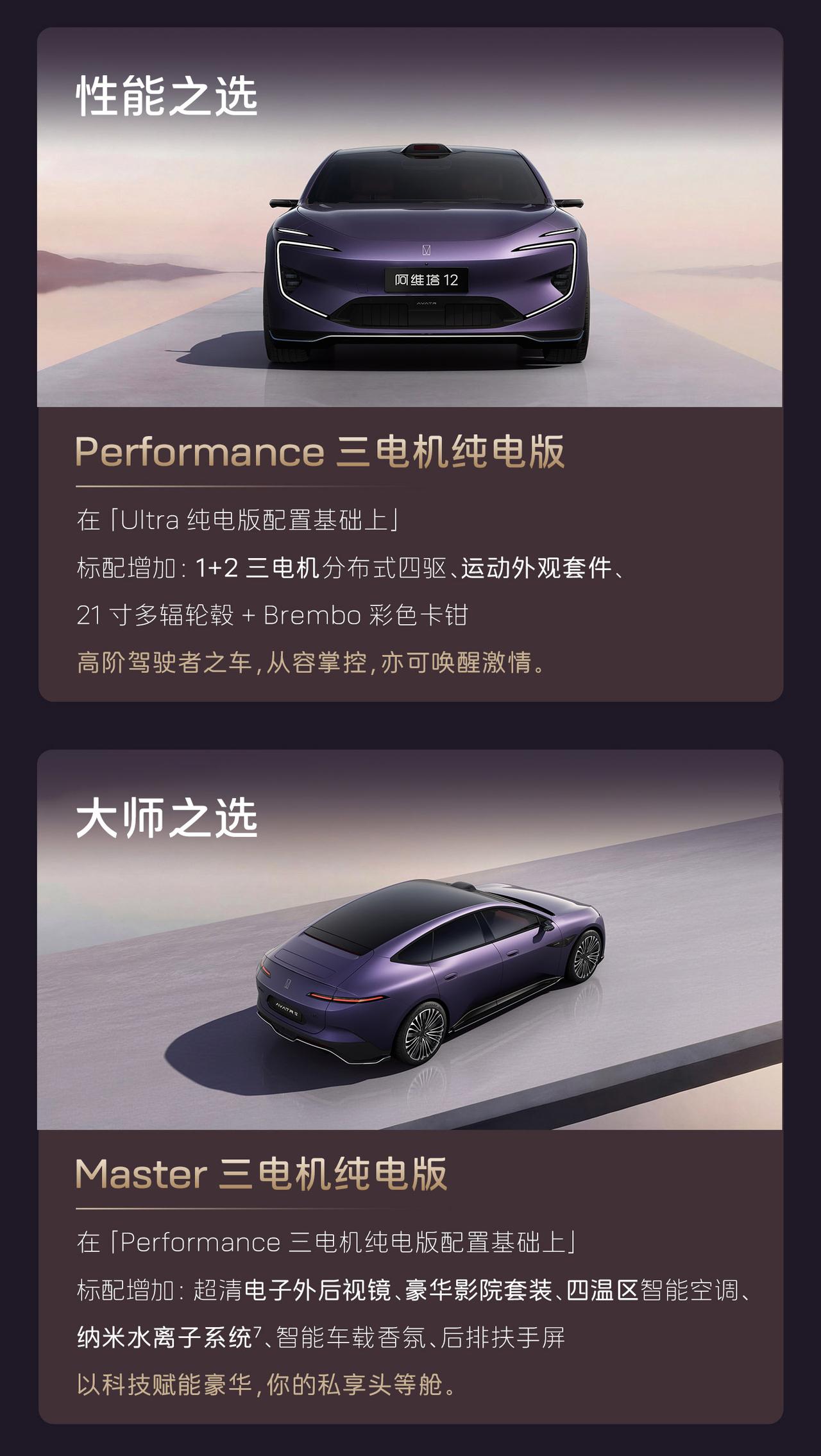 新阿维塔12正式开启预售,共推出7款车型,预售价29.99万起。 全系标配华为乾崑896线激光雷达(顶置+翼子板三激光布局),搭载华为乾崑ADS 4.0高阶智能驾驶系统。 动力方面搭载太行分布式电驱,三电机四驱版零百加速仅需2.71秒; 纯电版标配98度麒麟电池,增程版标配52度电池。 方向盘新增实体按键(一键语音、Boost加速); 门板优化应急拉手并新增开放式储物空间;车窗开关回归实体按键;顶棚升级天鹅绒材质。 搭载了电磁避震并且配备全维防碰撞系统CAS 4.0。【来自懂车帝车友圈】