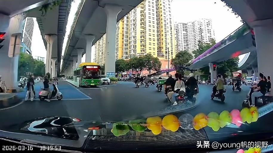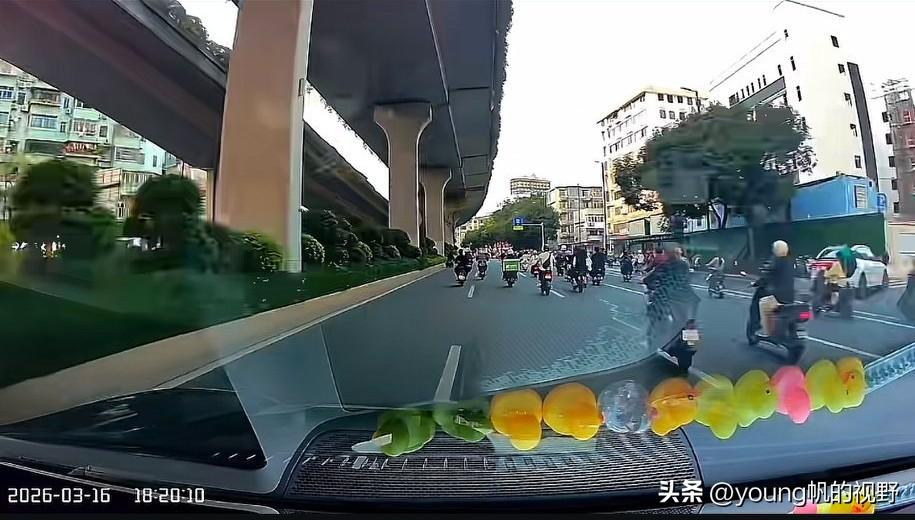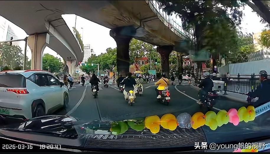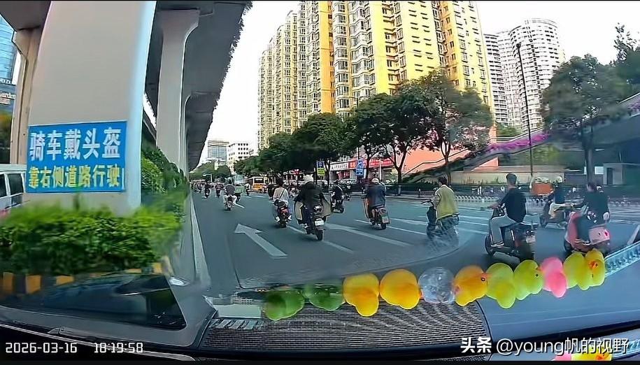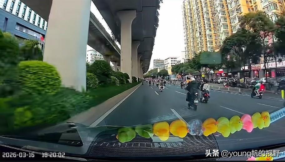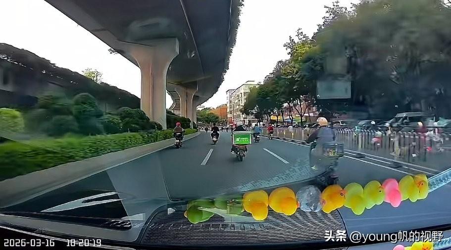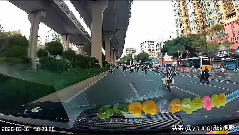 行车记录仪之下的电鸡之城广州。有车主驾车途经广州大道北路段,行车记录仪拍摄之下,前方道路清一色的都是电鸡。宽敞的道路,多个车道,给了电鸡尽情发挥的空间。对于私家车主来说,只能小心翼翼的跟在电鸡之后了。