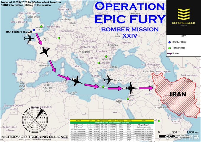 3月19日,2架 B-1B前往伊朗执行脉冲轰炸任务后,两架装备巡航导弹的 B-52H 轰炸机起飞执行任务,伴随的也同样有6架KC-135,这标志着停飞两天的轰炸任务完全恢复来源:DefenceGeek伊朗导弹击中以色列海法炼油厂哈梅内伊遇害以色列宣布袭击伊朗