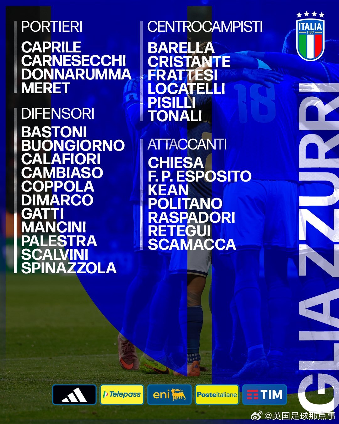 意大利公布世界杯附加赛名单!门将:卡普里莱(卡利亚里)、卡内塞基(亚特兰大)、多
