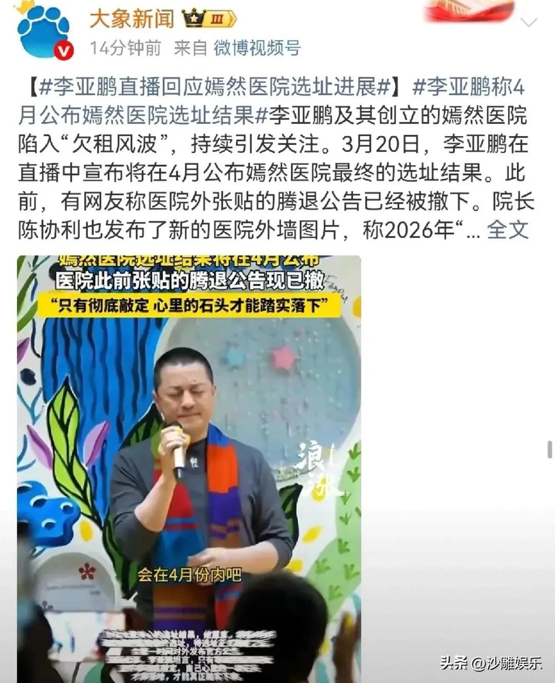 李亚鹏 ,迎来好消息! 3月20日晚,李亚鹏毫无预兆冲上全网热搜,不是因为新的舆论争议,而是他在直播中扔下的一个重磅消息:嫣然天使儿童医院的最终选址结果,将在4月正式公布!这句话一出,无数紧盯这场欠租风波的网友,瞬间松了口气。 这事要从年初的欠租风波说起。这家由李亚鹏、王菲2012年共同发起成立的国内首家民办非营利公益儿童医院,因拖欠租金超3年,被法院判决腾退现址,门口被贴上强制执行公告,一度传出要关停的消息。 风波发酵后,李亚鹏发布视频坦言医院过去5年一直在“坚持和关停之间挣扎”,甚至做好了接受关门的准备,但承诺一定会先做完预约的手术 。而就在大家揪心之际,网友发现医院门口的腾退公告已悄悄撤下,院长陈协利更是晒图表态2026年要“新开始、新征程”。 直到3月20日,李亚鹏在直播中亲口官宣选址进展,直言“等选址彻底定了,我心里的石头才算落地”,这场持续数月的风波,终于迎来了实质性转机。 这次事件最戳人的亮点,是风波之中从未停下的公益初心。哪怕面临关停风险,医院的手术从未中断,寒假里仍有近200名唇腭裂患儿预约了手术,17年来累计完成超1.6万例免费救助,这份坚守确实难得。 但槽点也同样无法回避:这场风波本质上暴露了公益机构的运营短板,租金纠纷持续数年闹到法院强制执行,才一步步推进解决,难免让公众对公益项目的运营管理产生质疑,也让不少网友呼吁公益机构要做到财务透明,不辜负大家的爱心。 在我看来,公益从来不是一时的热血,而是长久的坚守。李亚鹏的公益之路,一直伴随着争议,但不可否认的是,嫣然医院确实改写了上万名唇腭裂患儿的人生。 比起轰轰烈烈的造势,踏踏实实把医院落地、把公益做透明,才是对爱心最好的交代。4月的选址结果我们拭目以待,也希望这份坚守了17年的善意,能有一个安稳的归宿。