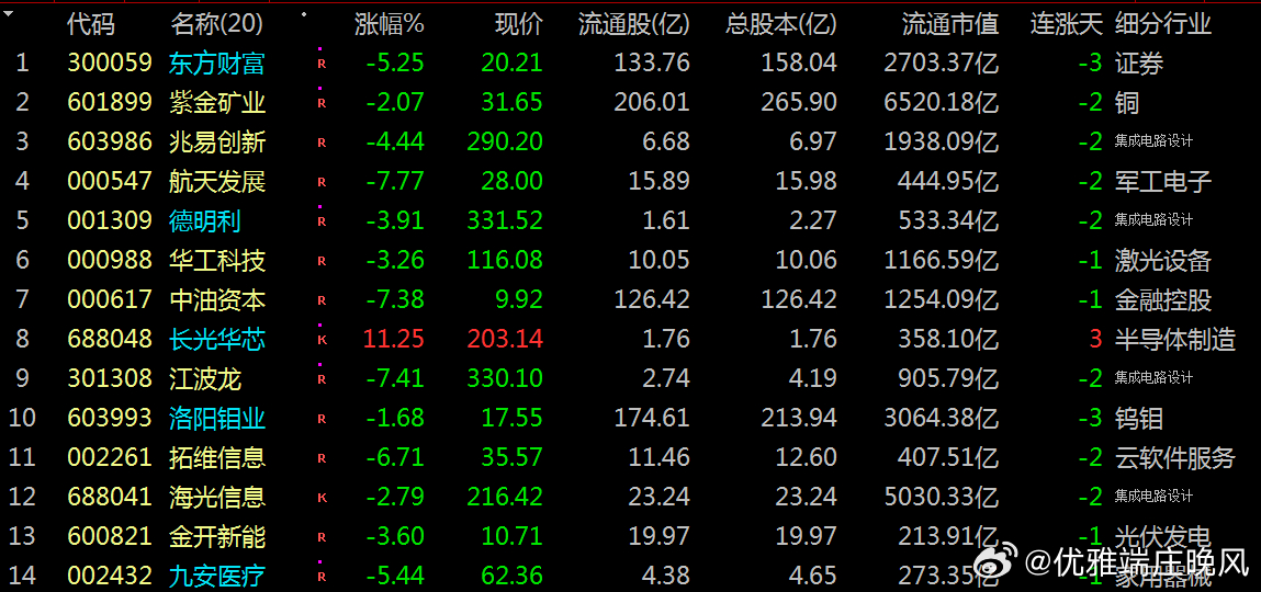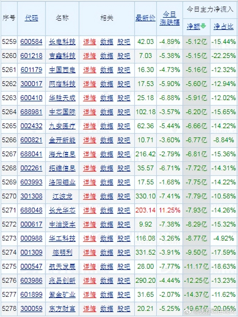 核心杀跌:龙头阴霾:除用上述户提及四只外,华工科技、中油资本、江波龙、洛阳钼业等亦位列主力净流出前十。呈现高位:科技与资源股集体出逃特征。