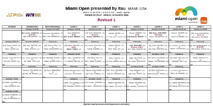 虎扑03月21日讯据WTA官方消息,迈阿密站第四日赛程更新,以下六场比赛取消,推迟到明日(3月22日)进行(具体时间待定):