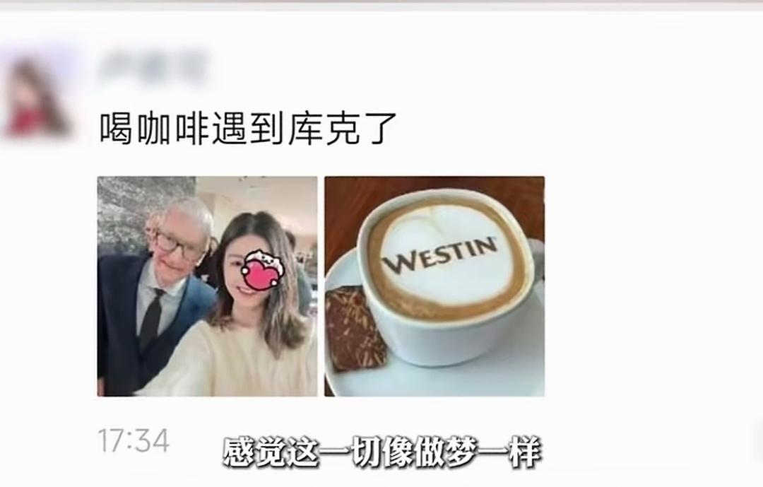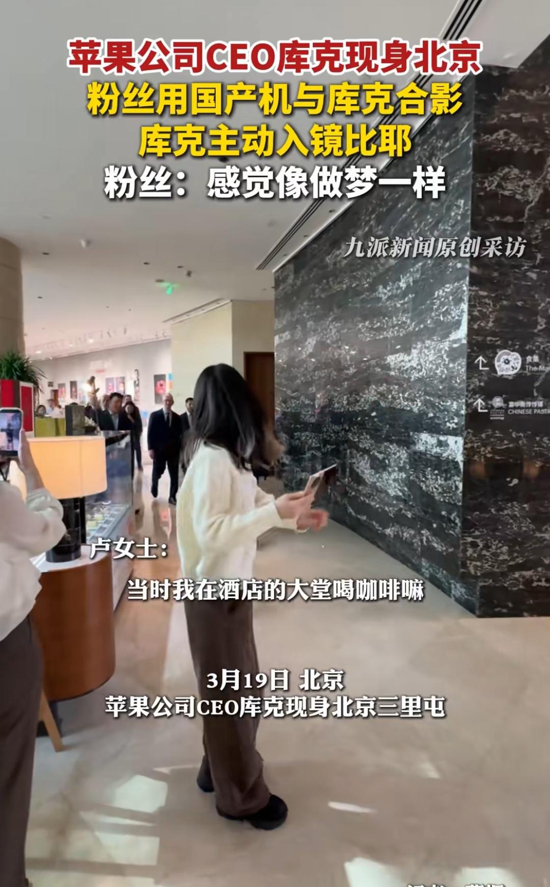 3月19日北京三里屯,美女与朋友在酒店喝咖啡时,工作人员说:库克来了。 美女打开国产折叠屏手机,站在库克必经之路准备拍照,当库克经过美女时,没想到他主动入镜比耶与美女合影。 在记者的镜头中美女开心得像花一样,难掩激动之情。 用国产手机与苹果CEO库克合影,难得,为美女点赞! 美女:感觉像做梦一样。