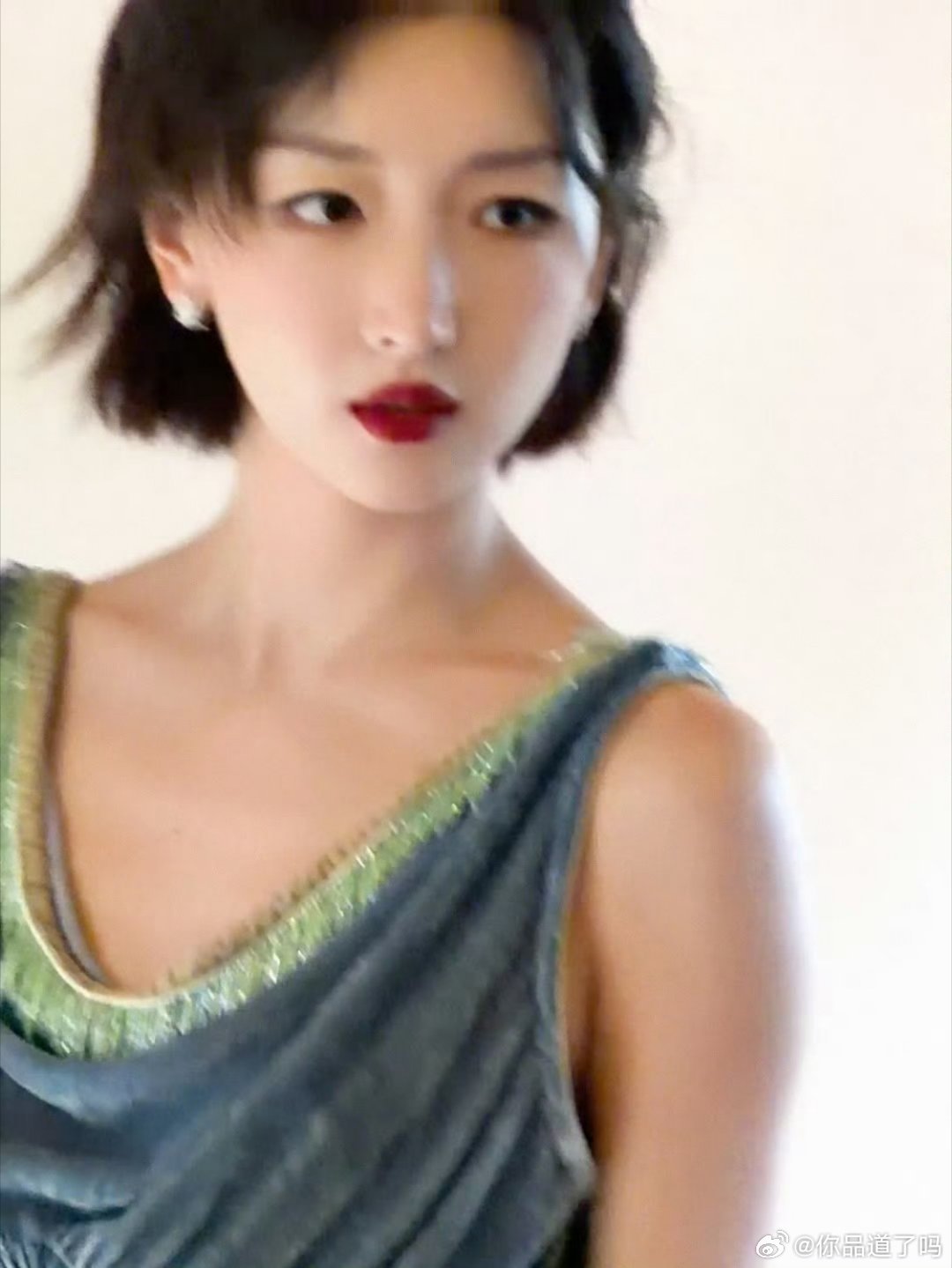 周冬雨在社交平台晒出美照,直言这条蓝色吊带裙是自己淘的百元款,简约剪裁搭配复古红唇,气质独特。