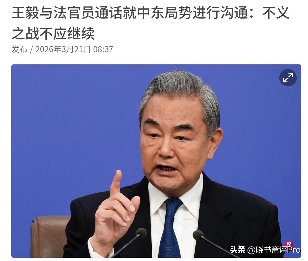 法国等不及了!要主动找中国谈! 3月21日,外媒报道称,中国外长王毅星期五应约同法国总统外事顾问博纳通电话,针对中东局势举行会谈。很显然,“应约”二字,这就表明这一通电话是法国主动打的,对于眼下局势,法国可以说非常的急。 双方主要谈了一些什么呢? 其一,王毅外长表示,当前中东局势仍在恶化,战事持续外溢扩大,表达了对冲突扩大的担忧。 其二,王毅外长表示,这场战争不仅冲击全球能源供应稳定,也带来巨大人道主义危机。希望面对当前危急局面,中法作为联合国安理会常任理事国,应加强战略沟通协调。 其三,王毅外长表示,要加大劝和促谈的努力,让联合国及安理会发挥应有作用,推动尽早恢复地区和平稳定。 其四,法国总统外事顾问博纳明确定性美以对伊军事行动无安理会授权,违反国际法。 其五,法国方面明确表示,希望推动局势降级、停火止战,避免更多国家卷入 。重启伊核谈判,走政治外交解决路径 。 法国为什么要跟我们打这一通电话呢吗?这主要有这几个原因: 其一,中东战事,法国的利益受到了影响,欧洲超过30%的原油经霍尔木兹。 其二,美以单边行动不跟欧洲商量,还强压盟友,而法国则意欲借此推动欧洲的战略自主。 其三,法国心里面很清楚,当下局势,欧洲说话分量不够,眼下只有中国能够跟冲突的双方说上话。而伊朗甚至明确表示,希望中国积极斡旋。 其四,在美国带头破坏联合国机制的情况下,法国心里面很清楚,眼下跟中国站在一起,才能捍卫联合国的权威。 因此,法国急着跟我们通话,根本原因就是法国看见欧洲利益在受损,中东局势越来越恶化,法国必须主动跟中国协调立场,给紧张局势降温。而这事实上也是给美以施压,让美以明白,中东局势不能再由着美以任性升级。欧洲与这场战争不仅要划清界限,而且还要捍卫国际法和联合国宪章,保护自身利益。