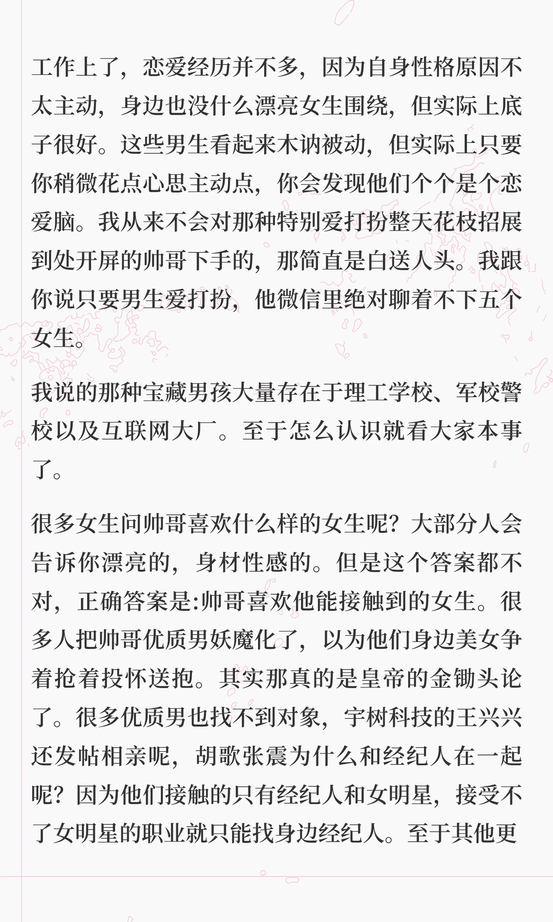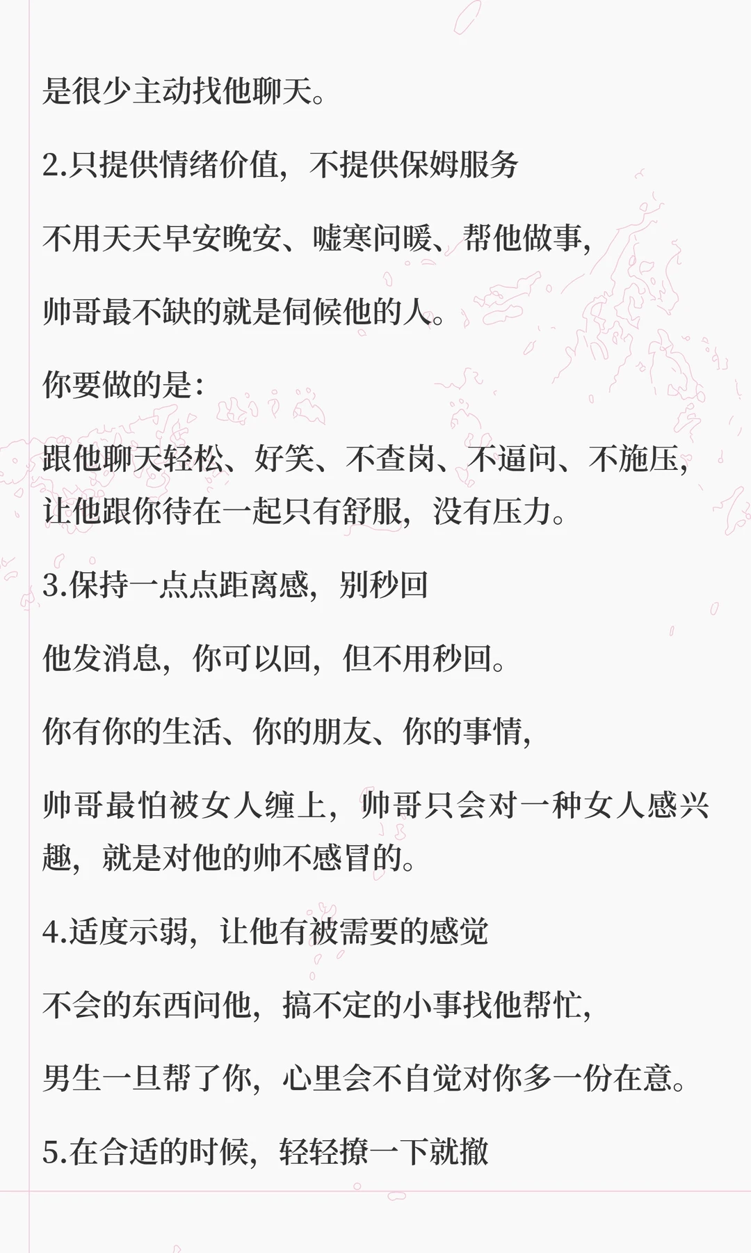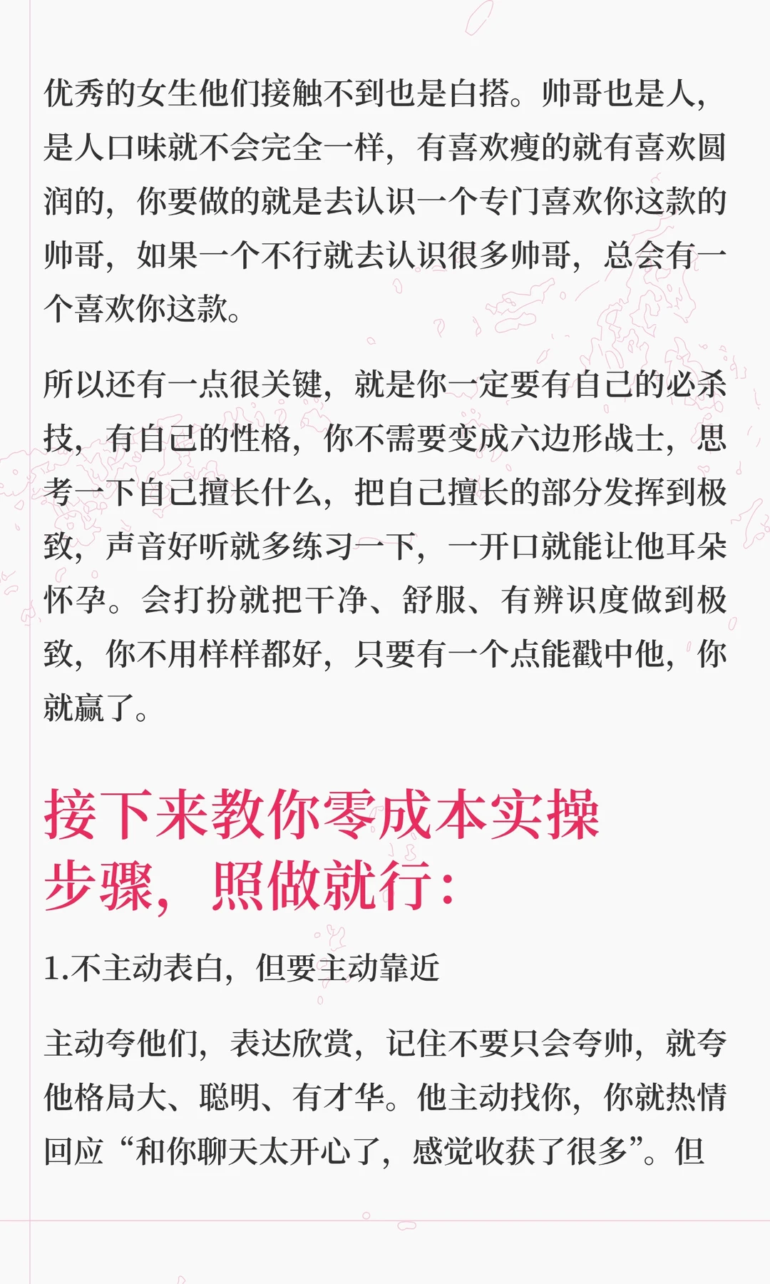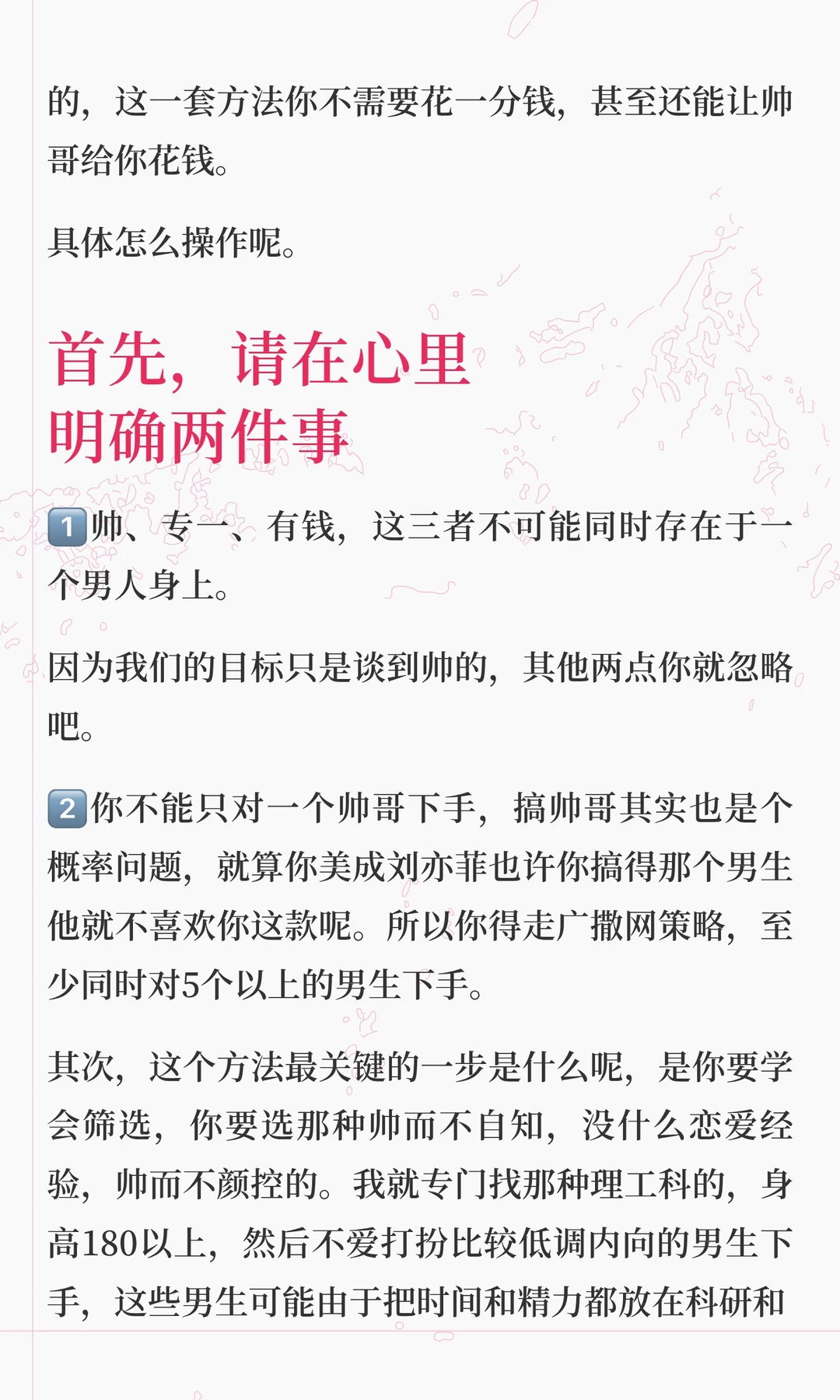 通过广撒网策略,筛选帅而不自知、专一且有钱的男生,主动接近并提供情绪价值,保持距离感,适度示弱,适时撩拨,最终赢得心仪男生的青睐。