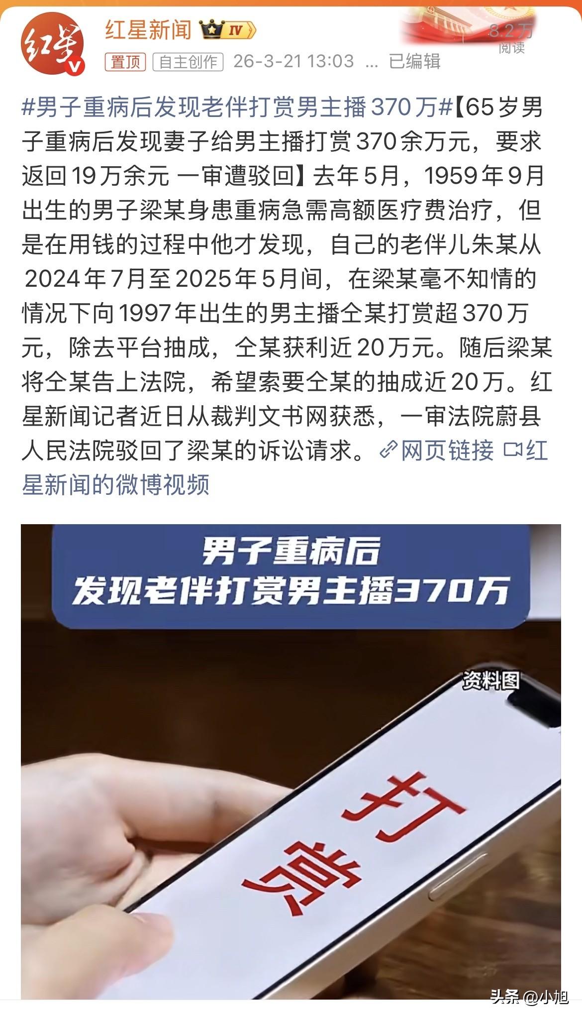 65岁,身患重病,等着钱救命。 翻遍家里所有积蓄,才发现银行卡里少了370万。 这些钱,被自己65岁的老伴,在一年不到的时间里,打赏给了一个1997年出生的男主播。 河北蔚县的梁某,去年5月查出重病。他躺在病床上,医生催着交费,他让老伴朱某去取钱。朱某支支吾吾,半天拿不出来。梁某觉得不对劲,拖着病体去查账。 这一查,天塌了。 银行卡里,少了370多万。 他一条一条查流水,从2024年7月查到2025年5月,整整10个月,几乎每天都有钱转出去。少的时候几百,多的时候上万。有一天的打赏金额,高达15767块1毛钱。 这些钱,全都进了同一个人的口袋。一个叫仝某的男主播,1997年出生,比朱某小了将近40岁。 梁某浑身发抖。他问朱某,你打赏这些钱干什么?朱某低着头,不说话。 朱某的退休金,每个月只有3000块。梁某算了一下,这10个月里,有227天她在打赏,其中有170天,每天打赏超过1000块。她是怎么做到的?她把自己一辈子的积蓄,全部掏空了。 梁某起诉了那个主播,要求返还19万。那是仝某扣除平台抽成后,实际拿到手的钱。梁某想,平台的350万拿不回来了,但主播手里的20万,总该要回来救命吧。 法院驳回了他的请求。 宣判那天,梁某一个人坐在医院走廊里。老伴朱某没有来。他攥着判决书,手一直在抖。他不明白,为什么自己生病需要钱的时候,钱没了。为什么打官司要钱的时候,法院说不能要。 他想起自己查出重病那天,医生把他叫到办公室,说需要尽快手术,费用不低。他说没关系,这些年攒了点钱,够用。他以为自己手里握着的是救命稻草,没想到那根稻草,早就被别人拿走了。 朱某这10个月里,到底在想什么? 她后来在法庭上说,仝某反复跟她讲,自己是农村出来的,单亲家庭,从小没有父亲,日子过得很苦。她说她听了心疼。仝某还说,自己直播间没人气,让她去打赏撑场面。她说她心软,就去了。 她说仝某每天给她发微信,嘘寒问暖,喊她姐姐。她说她一个人在家,孩子们不在身边,丈夫也不太跟她说话,突然有个人这么关心她,她觉得心里暖和。她说她知道打赏要花钱,但她停不下来。 她说这些的时候,声音很轻,像是在自言自语。 梁某坐在对面,一句话都没说。他可能在想,自己这些年是不是对老伴太冷了。也可能在想,自己躺在病床上等钱救命的时候,老伴却把钱撒给了一个20多岁的年轻人,跟他说“爱你”。 370万,他们夫妻俩攒了一辈子。可能是卖了一辈子的力气,可能是一分一分从牙缝里省出来的。梁某一直以为这些钱还在,以为关键时刻能救命。他不知道,那些钱早就不属于他了。 而那个1997年出生的主播,拿到手的不到20万。剩下的350多万,全进了平台的口袋。 有网友算了一笔账:平台抽走了95%,主播只拿了5%。有人说,这哪里是直播,这是把老年人的家底直接搬走。也有人说,平台抽成再高,也是老太太自己点的,能怪谁? 梁某可能从来没想过平台抽成的事。他只知道,钱没了,病得治,命得救。他想拿回那20万,法院说不行。那350万,他连想都不敢想。 这起官司,从一开始就注定赢不了。因为法律上,朱某每一次打赏,都是“自愿消费”。平台收钱,合法。主播提供服务,合理。至于钱是不是夫妻共同财产,是不是救命钱,法律不看这些。法律看的是,你点了一下,你自愿的,钱就出去了,回不来了。 梁某现在还在治病。钱从哪里来,没人知道。朱某还在那个家里,两个人抬头不见低头见,不知道还说不说话。 那个直播间,可能已经换了新主播,继续对着屏幕喊“姐姐”。而朱某的手机里,可能已经没有那个App了。 你怎么看这件事? 信息来源:红星新闻