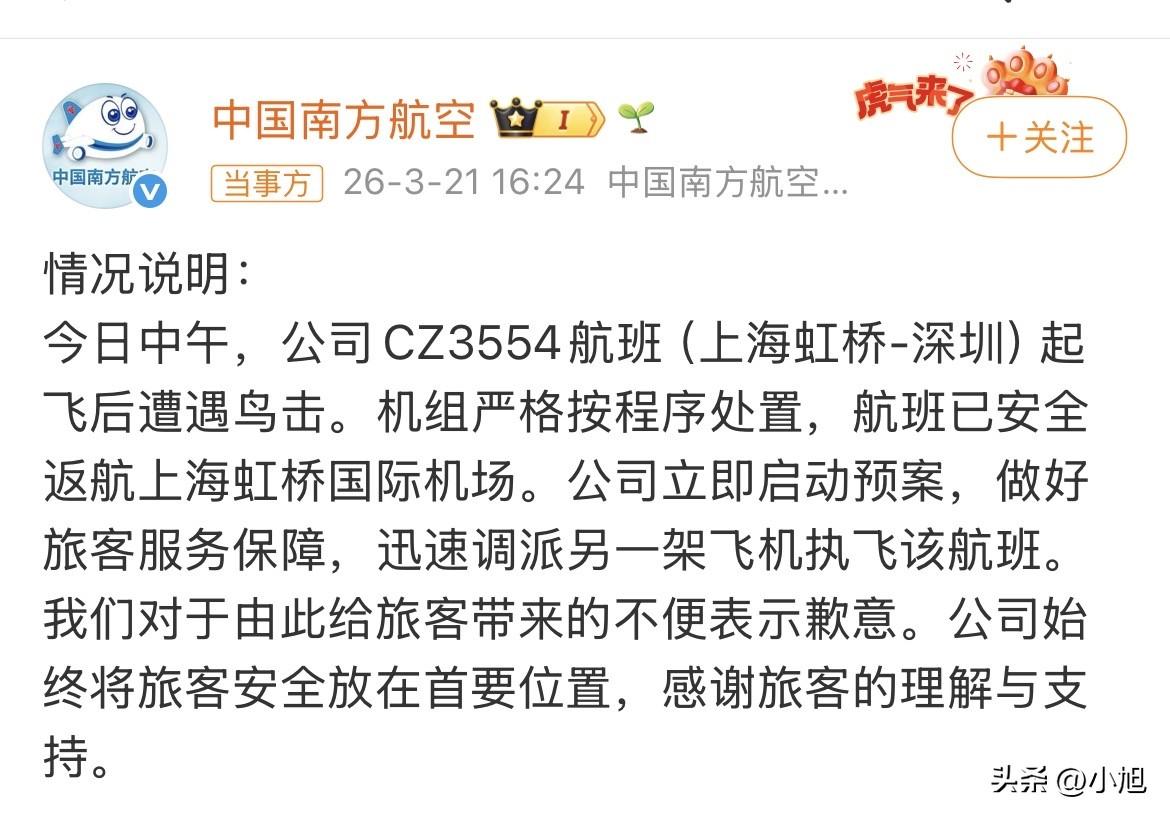 中午12点43分,上海虹桥机场,南航CZ3554航班刚刚抬轮起飞。 一切看起来都很正常。飞机在爬升,乘客们有的在闭目养神,有的在看窗外逐渐变小的城市。但有人感觉到了,机身传来一阵轻微的抖动。 这可不是遇到气流那么简单。 飞机上有人嘀咕了一句:“是不是撞到什么东西了?” 驾驶舱里,机组人员已经进入紧急状态。仪表盘上肯定有异常提示,他们没时间多想,脑子里只有一个念头:把这一飞机的人安全带回去。 从起飞到决定返航,也就过了20多分钟。12点43分起飞,13点06分,这架飞机又重重地落回了虹桥机场的跑道上。 落地的那一刻,机舱里估计安静得能听见心跳。 等飞机停稳,乘客们从舷窗往外看,这才看清楚到底发生了什么。有人拍下了当时的画面——飞机机头,那个装着雷达的地方,整个罩子都没了。 有乘客说得更直接,下机的时候看见机头那块,雷达罩像是脱落了,只剩下光秃秃的设备露在外面。现场的人后来看见,机务师傅拿着大块的塑料布,把机头那个位置严严实实地包了起来。 那样子,看着确实有点狼狈。 后来南航发了通报,说是因为遭遇了鸟击。机组按程序处置,安全返航,又调了一架飞机过来,把旅客重新送走。 这话说得轻描淡写,可经历过的人才知道,那一瞬间有多吓人。 你想啊,一只鸟,哪怕就几斤重,在飞机几百公里的时速面前,撞上去的冲击力就是几吨。这要是撞在发动机上,或者挡风玻璃上,后果不敢想。这次偏偏撞在了机头最脆弱的雷达罩上,整个罩子都掀飞了。 那一飞机的人,当时就在那个被撞烂的机头后面坐着。 有人说,机组反应够快,发现不对立马回头,这是专业的。也有人说,这鸟击防不胜防,机场周围天天驱鸟,还是躲不开。还有人扒出来,这架飞机机龄8年,是个老将了,这一下估计伤得不轻。 好在,人没事。 不过你说这事儿巧不巧,偏偏是中午,偏偏是起飞的关键阶段。就那么一只鸟,愣是把一架大飞机逼得掉头往回跑。地勤用塑料布裹机头那个画面,看着又好笑又心酸。这一裹,裹住的不只是雷达,也是那23分钟里所有乘客心里的不安。 这事你怎么看?要是你当时坐在这架飞机上,落地了还敢接着飞吗?