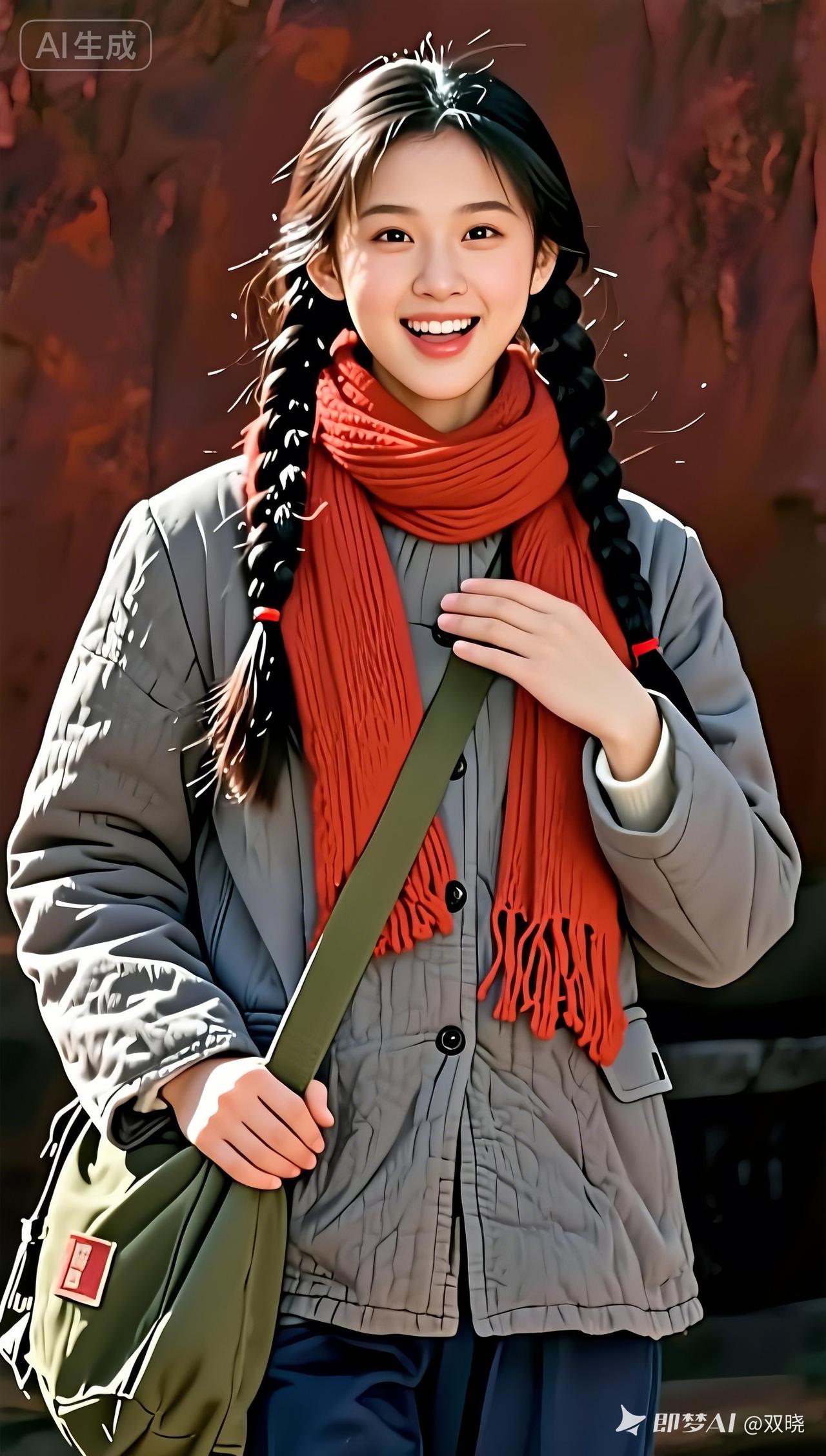 冬日暖阳下的甜美少女,红围巾与灰外套的完美搭配,元气满满!🌞💕