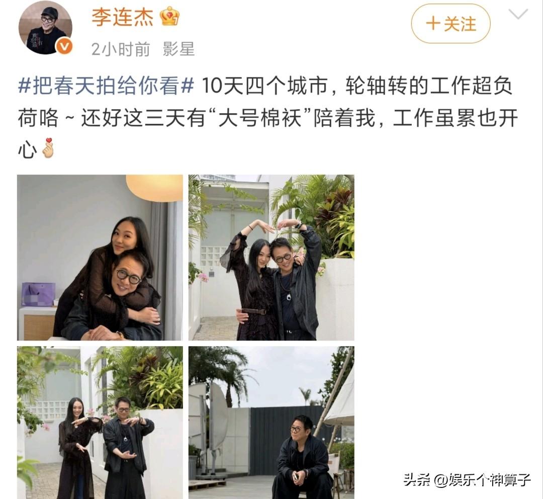 李连杰,太开心了! 3月21日,李连杰在社交平台发文,并晒出与女儿的合影,看完文案,真的让人心疼又羡慕。 李连杰透露,10天期间奔走四个城市,工作几乎轮轴转,还好有“大号棉袄”的陪伴,就算再累也开心。 照片中,大女儿Jane从后面搂着爸爸的脖子,李连杰满脸幸福的笑容,父女二人还对着镜头比心,画面好温馨。 这几天,李连杰现身北海,与很多明星聚在一起,讲解太极拳,并且亲自展示,还现场教学,想必非常劳累。 还好Jane一直在身旁陪伴,也就是李连杰所说的“大号棉袄”,都说女儿就是父亲的小棉袄,看来,这话还真不假。 说实话,虽然李连杰状态看起来很好,不过,高清镜头下,也是满脸的褶皱,真是岁月不饶人啊。 这个年纪,有女儿贴心照顾,才是最大的幸福,再忙再累,也感到开心。 该说不说,这么一看,Jane真的很漂亮,而且还有明星气质,关键还特别优秀,好让人羡慕。