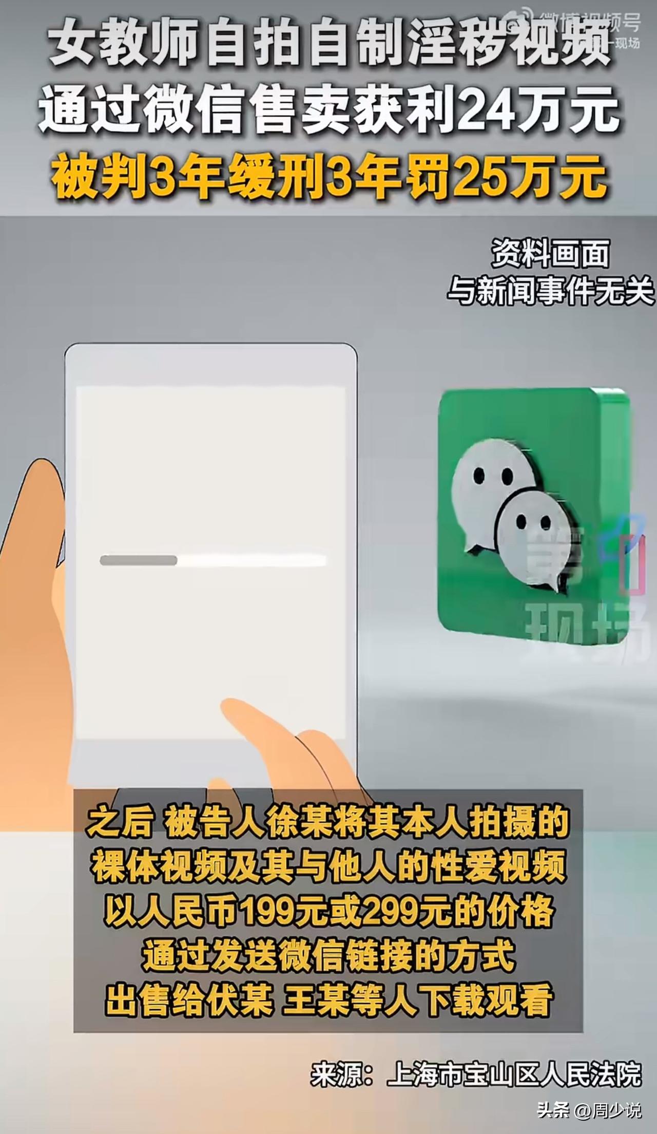 “惊掉下巴!”近日,湖南祁东某职专原女教师徐某,因制作、贩卖淫秽视频牟利一案,引发全网哗然。 这位教师从2023年9月开始,用某信群发“闪照”引流,私下售卖自拍不雅视频,定价199元、299元不等,短短8个月非法获利超24万元。 经法院审理,其行为已构成制作、贩卖淫秽物品牟利罪,鉴于她坦白、退赃、立功且认罪认罚,最终被判有期徒刑三年、缓刑三年,罚金25万元。 此事在网上曝光后,瞬间引发全网热议。有不少网友直言:“身为教师,底线都丢了,实在不配为人师表”。 也有人感慨:“年轻不是借口,法律和师德的红线,碰不得”。 在周少看来,这位教师确实把底线都丢了,枉为人师。教师本是育人的职业,偏偏有人被快钱冲昏头脑,把身份与底线抛在脑后,可谓是自毁前程。 这件事也给不少年轻人敲了警钟,比起追逐短期利益,守住职业操守和法律底线,这才是更稳妥的人生选择。 尤其是教育从业者,一言一行都影响着学生,更该时刻自重自省,别让一时糊涂,毁掉整个人生。#周少说教育# #寻美湖南# #寻美三湘#