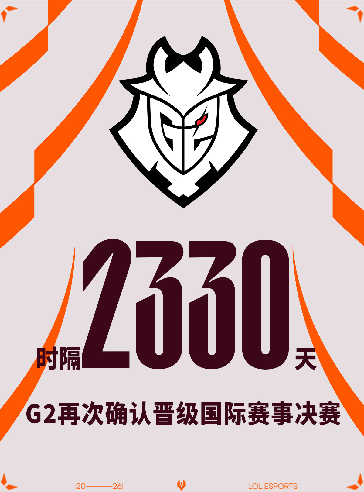 2026年3月21日G2战胜GEN,这是G2时隔2330天再次确认进入国际赛事决赛,上一次还是2019年11月03日G23:1战胜SKT后确认晋级,恭喜G2!