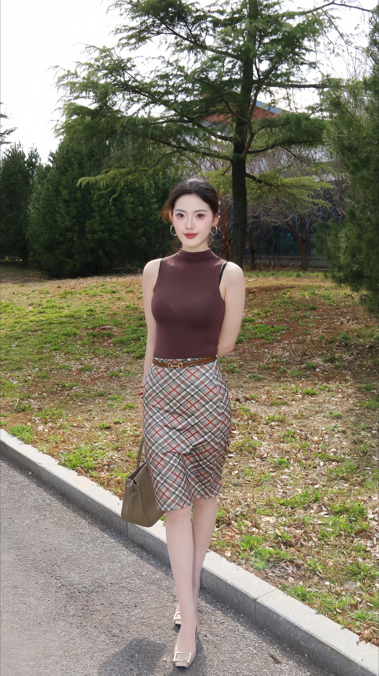 优雅穿搭指南:棕色高领衫+格子裙,尽显时尚魅力!👗👠