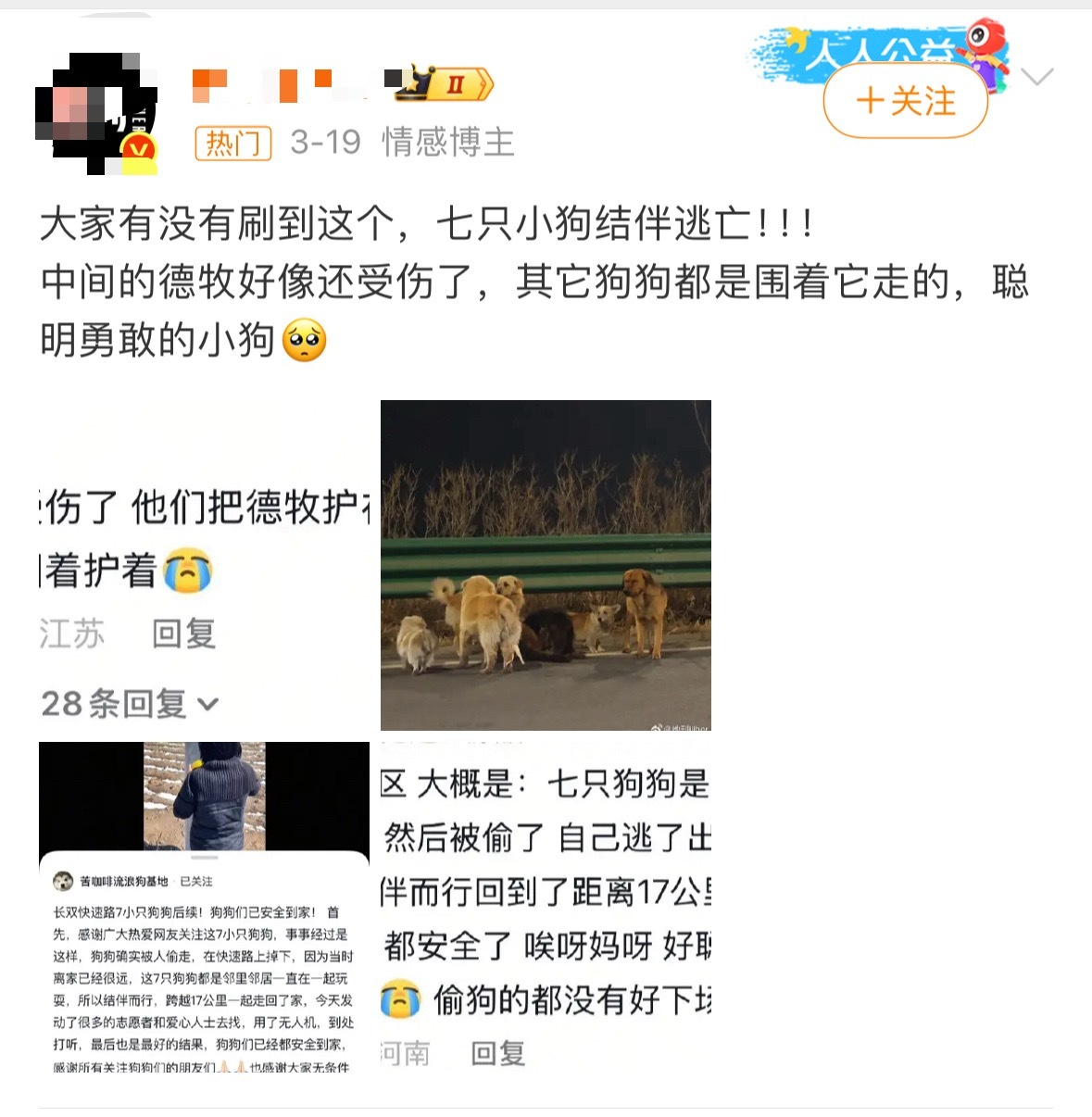 7只小狗结伴 励志片变爱情片哈哈哈笑疯了。网友给7只小狗脑补了一出被偷越狱的大戏。结果是其中一种德牧自己发情走丢了,其他的六只都是舔狗。