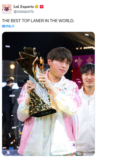 虎扑03月23日讯LOL官推分享Bin捧杯照并配文:世界第一上单
