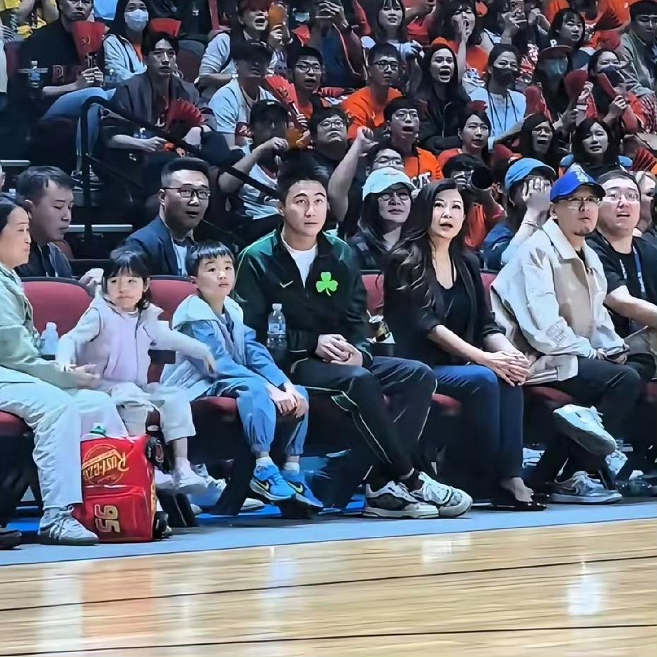 何猷君携一双儿女现身澳门,现场观看东亚超级联赛。两个小家伙看得全神贯注,模样十分