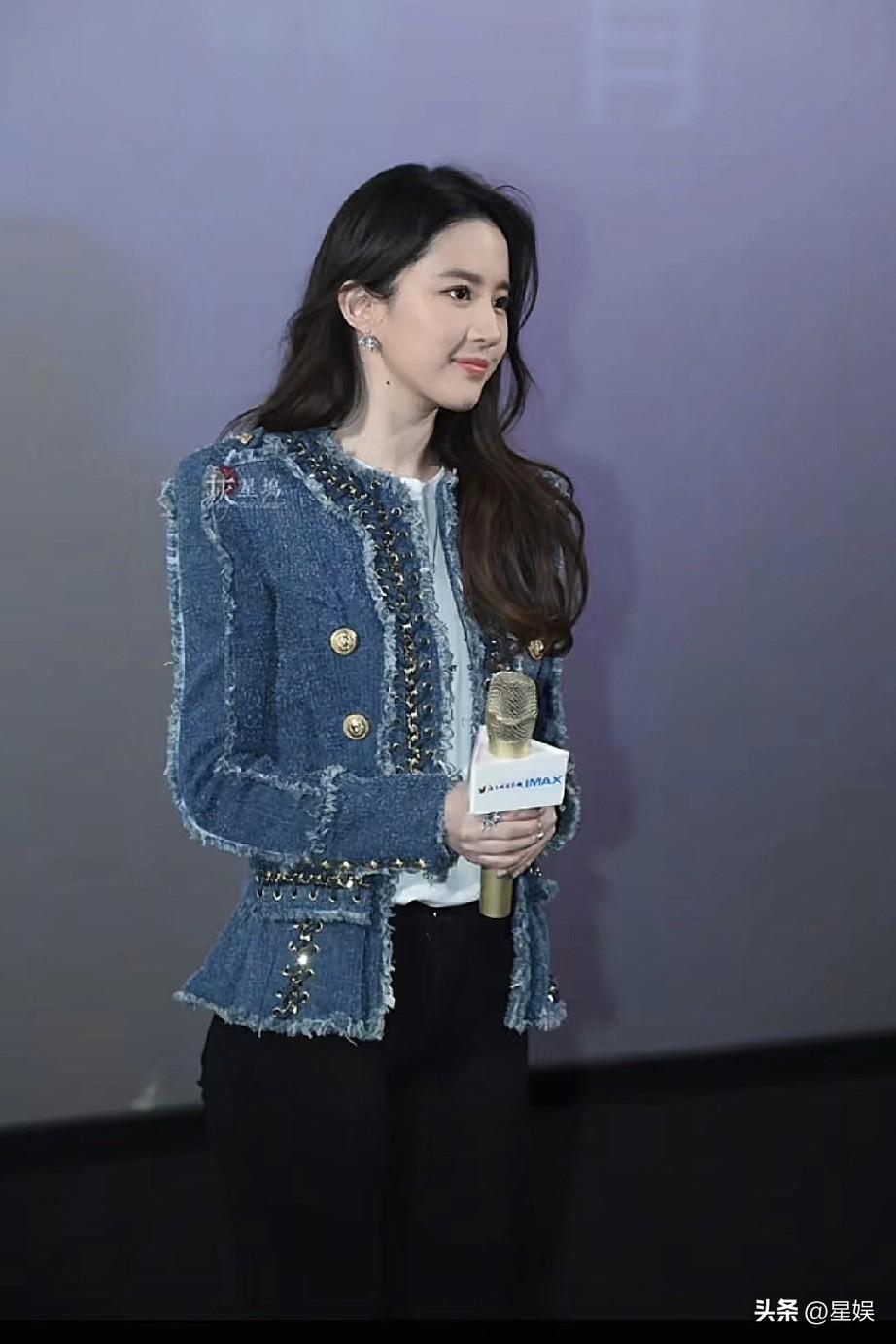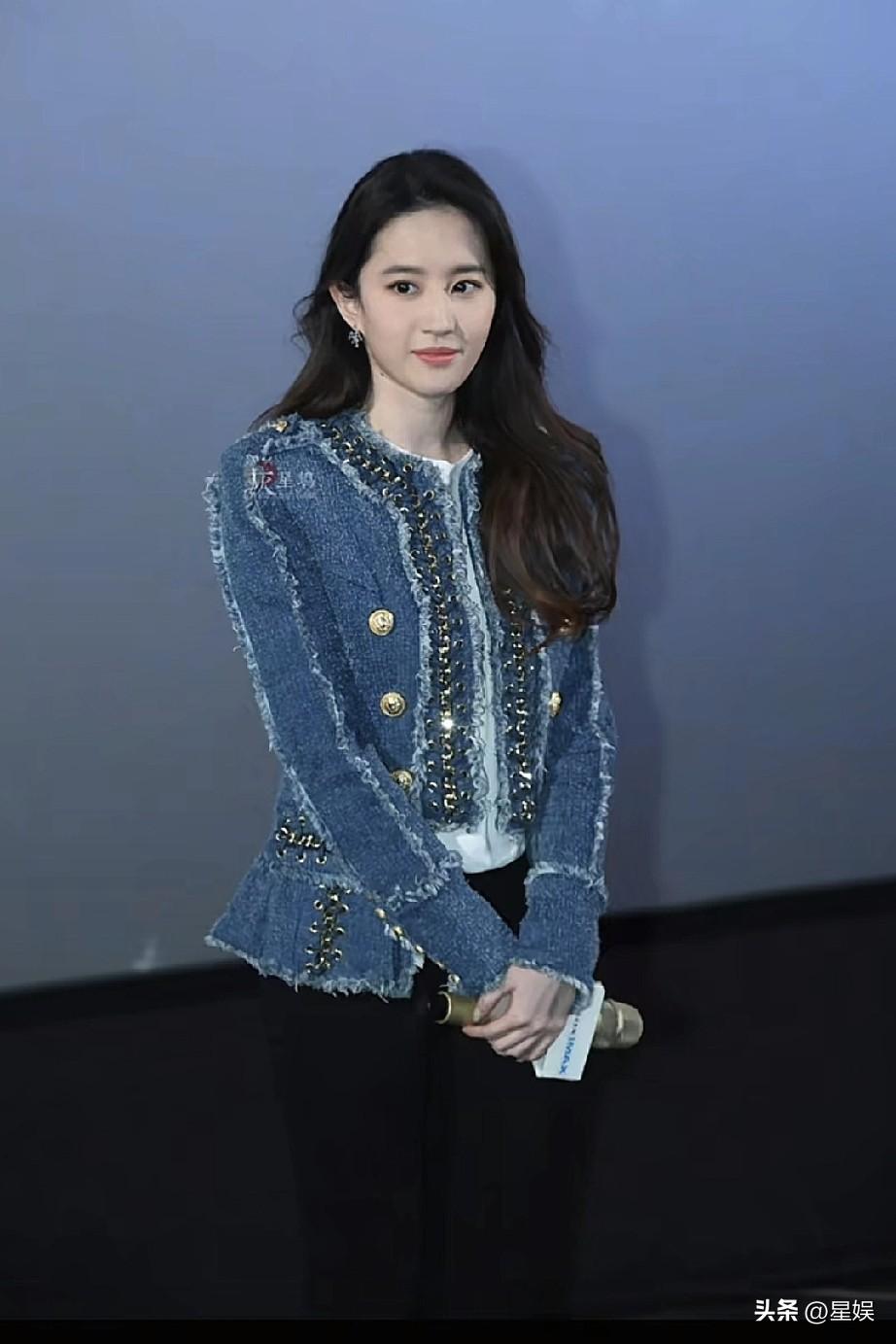 刘亦菲牛仔外套搭配黑裤