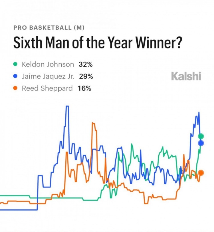 体育预测平台Kalshi最新数据显示,目前马刺球员凯尔登·约翰逊是今年最佳第六人的最大热门人选,他的概率达到32%。