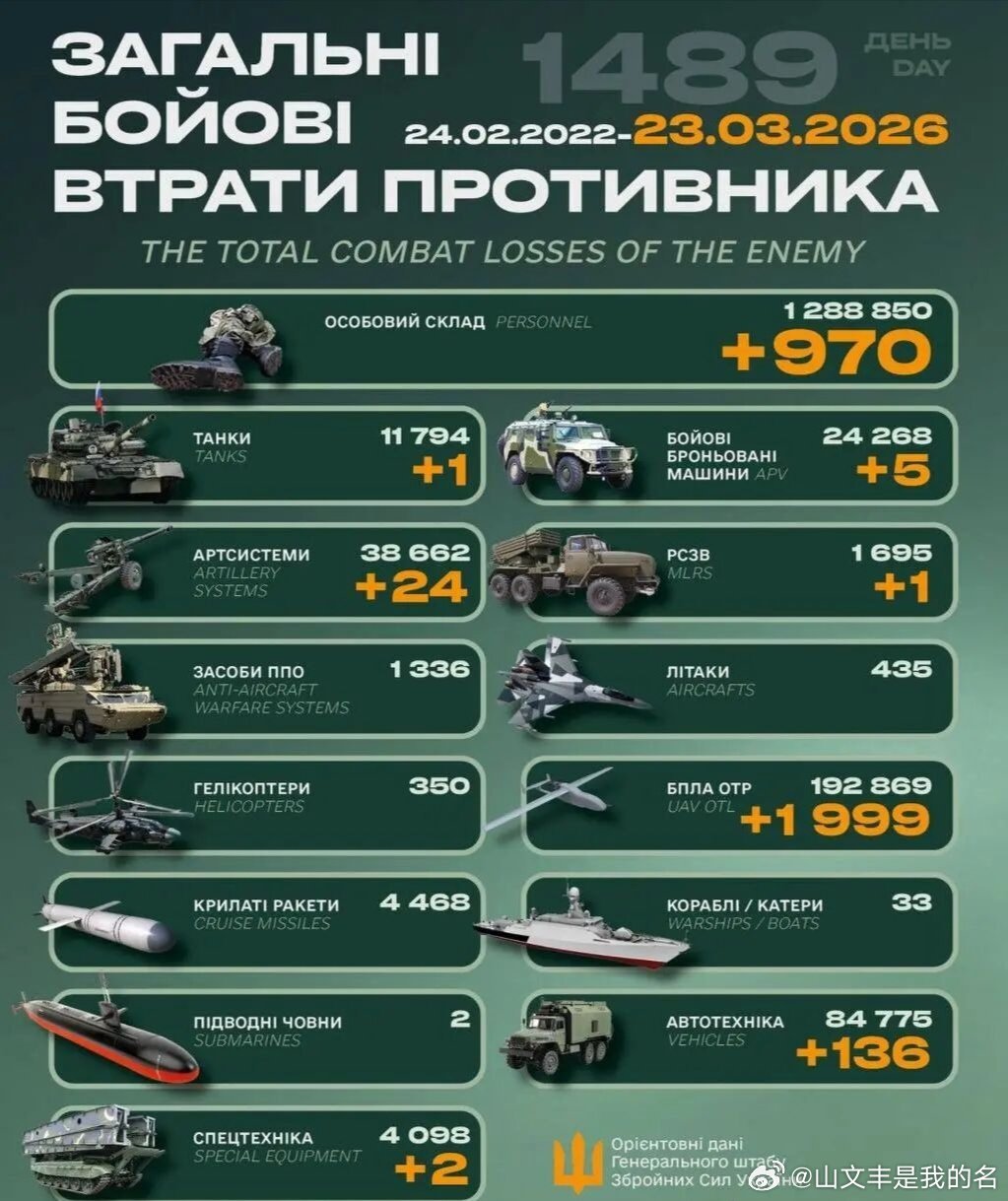 乌俄战争进入第1489天,乌克兰总参谋部发布战报:过去24小时乌俄双方交战83次,其中13次在胡利亚伊波列(13次在苏梅)、18次在康斯坦丁诺夫卡、5次在利曼、28次在波克罗夫斯克、6次在南顿涅茨克区域。毙伤俄970名。俄军累计损失1288850人。摧毁俄1辆坦克、5辆装甲车、24门火炮、1个火箭发射装置、1999架大型无人机、136辆军车、2件特种设备。