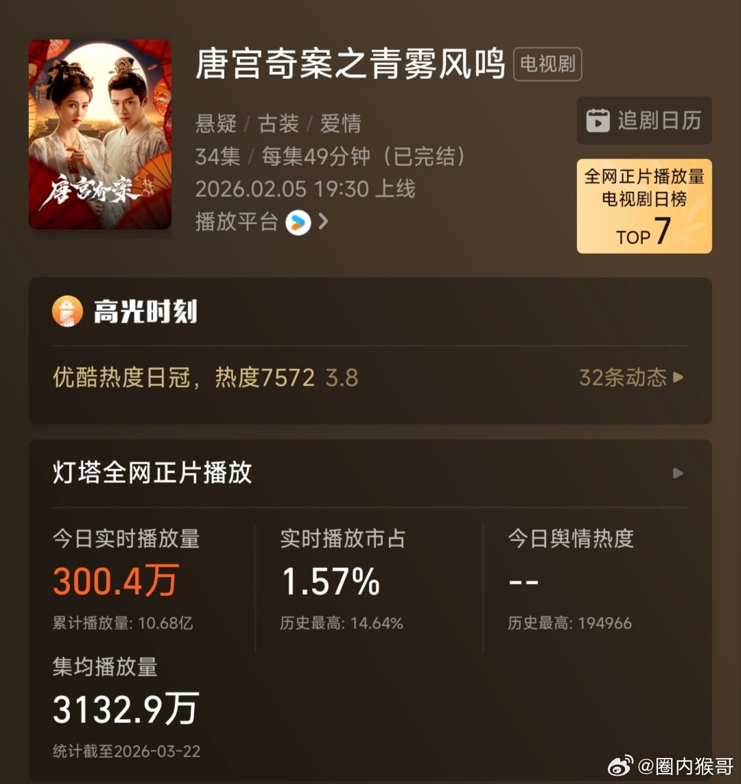 白鹿的唐宫奇案是优酷自2025年8月以来,近8个月内灯塔集均播放量最高的一部剧,实打实没掺水分已高达3130万,白鹿作为剧花还是牛啊,底盘很高!