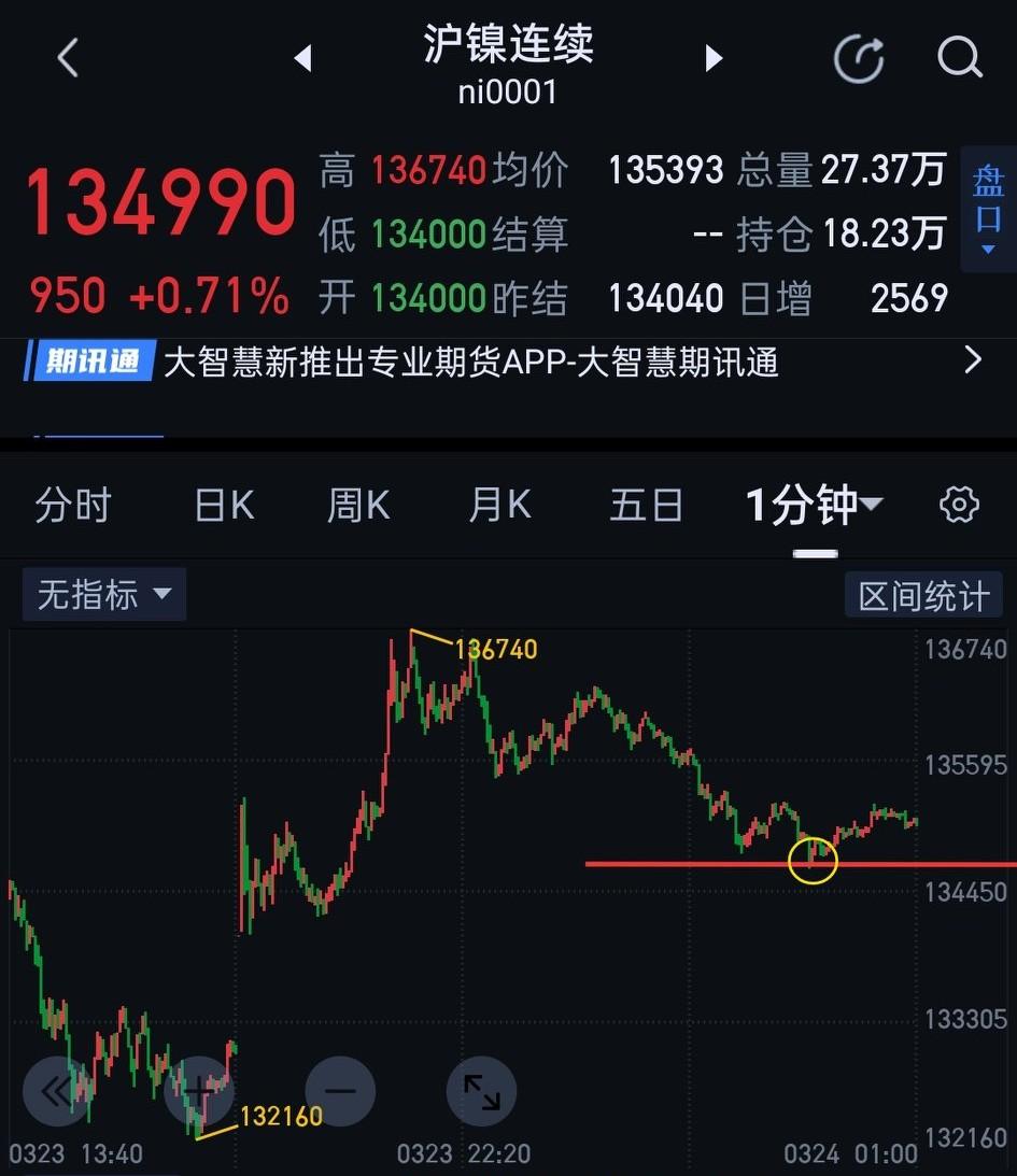 沪镍,短期走势仍处于灰色地带。 夜盘的沪镍仍未有效摆脱图(1)一分钟中枢的纠缠。目前在一分钟级别切入点仍然模糊。 日盘的134600(图2)能否有效站稳是关键。站稳,后续要观察对136740突破的有效性(可用是否形成线段背驰为参考)。若不能站稳,暂用图(1)中枢震荡的视角跟随。如有快速下破中枢的动作,则要防止反抽形成该中枢三卖。 沪镍目前仍是神仙打架,大的方向未产生前,操作仍需谨慎。