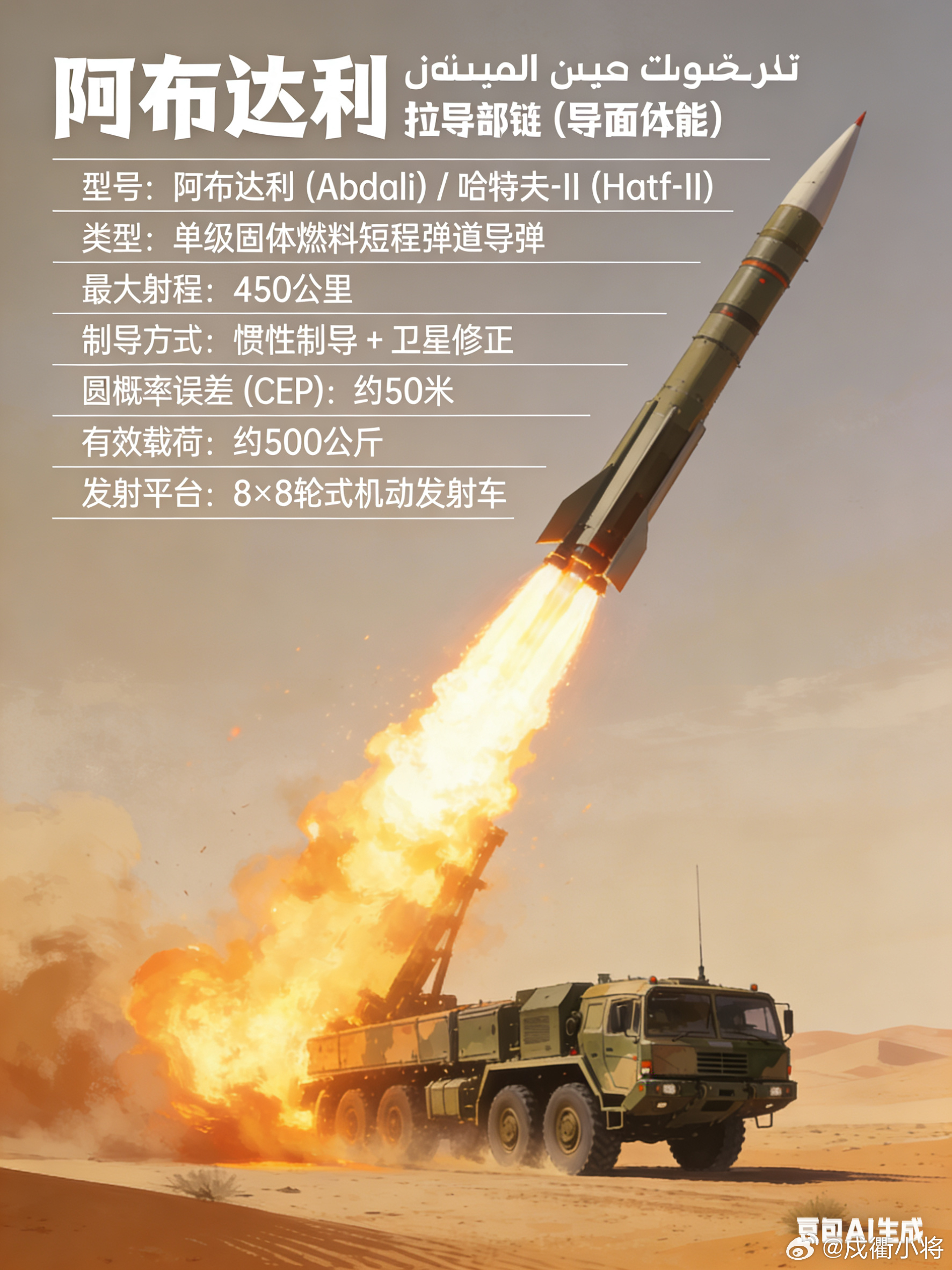 阿布达利(Abdali)是巴基斯坦自主研制的短程弹道导弹,军方正式代号为哈特夫‑II(Hatf‑II),由巴基斯坦国防科技组织与空间研究机构联合开发,主要用于陆军战术打击和前线核威慑。该导弹采用单级固体燃料推进,射程约450公里,因为使用固体燃料,发射准备时间短,配合轮式越野发射车可以实现快速机动部署,能够在短时间内完成阵地架设、发射并撤离,战场生存能力较强,非常适合边境地区的快速反应作战。阿布达利导弹采用惯性导航加卫星修正的复合制导方式,打击精度较高,可搭载常规高爆弹头、子母弹药,也可搭载战术核弹头,有效载荷约500公斤,主要用于打击敌方前线机场、指挥通信中心、防空阵地以及装甲集结地等关键战术目标。这款导弹在2013年完成首次成功试射,之后多次进行验证发射,目前已经正式列装巴基斯坦陆军战略部队司令部,成为巴基斯坦近程战术打击体系的重要装备,与沙欣、巴布尔等系列导弹共同组成了覆盖近、中、远程的导弹威慑力量。军事ai新视野ai创造营