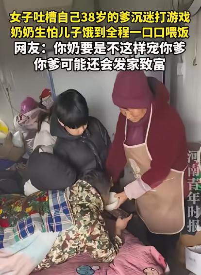 惯子如杀子!河南,38岁男子整天啥也不干,就躺在床上玩手机,脸不洗,饭不吃,更不出去干活给两个孩子挣学费。男子母亲不但不劝,一到饭点便把饭端到床边,一口一口给他喂。女儿实在看不下去,将这一幕发到网上,吐槽自己“巨婴”般的父亲,网友:你奶要是不这样宠你爹,你爹还可能发家致富。   最近刷到一条视频,看完心里又气又堵得慌,说的是河南一位38岁的男子,活成了让人难以理解的样子。   视频是男子的女儿发的,画面里,这个38岁的男人,整天啥也不干,就躺在床上刷手机,脸不牙不刷,连饭都懒得吃,家里还有两个孩子,正等着交学费,可他半点不急,从来没想过出去找份活,给孩子挣学费补贴家用。   最让人无奈的是他的母亲,今年也快七十岁的人了,不但不劝儿子振作起来,反而把他宠成了“小祖宗”,一到饭点,就端着碗走到床边,一口一口地喂儿子吃饭,生怕儿子饿着累着。   女儿看在眼里,急在心里,实在忍不下去,才把这一幕拍下来发到网上,吐槽自己有个“巨婴”般的父亲,连基本的生活自理能力都没有,更别说承担起做父亲的责任。   视频发出去后,很快就引发了网友的热议,有网友留言说,你奶要是不这样宠你爹,你爹说不定早就扛起家里的担子,甚至有可能发家致富了,这话听着扎心,但确实有道理。   说白了,这个38岁男子之所以能懒到这种地步,根源全在他母亲的溺爱,可能在老人眼里,不管儿子多大,都是自己的孩子,可她不知道,这种无底线的宠爱,不是爱,而是害。   河南之前也有过类似的例子,一个叫杨锁的小伙,从小被父母宠上天,吃饭靠喂,出门靠抱,父母去世后,他连基本的生存都成了问题,最后活活饿死在家里,这就是溺爱最惨痛的代价。   我不敢想象,这两个孩子看着自己的父亲整天躺在床上,看着奶奶一把年纪还要伺候父亲,心里是什么滋味,他们要交学费,要正常生活,这些压力最后大概率都会落到孩子和老人身上。   这个38岁的男人,本该是家里的顶梁柱,却把自己活成了家里的累赘,说到底,还是被溺爱冲昏了头脑,丧失了做人的责任感。   其实不是他不能干活,也不是他不会干活,而是从小被母亲宠得失去了动手的能力,也失去了奋斗的意识,他习惯了衣来伸手、饭来张口的生活,觉得有人会一直伺候他,不用自己辛苦打拼。   可他忘了,母亲总会老去,孩子总会长大,没有人能一直包容他的懒惰和无能,这件事没有复杂的情节,却给所有家长提了个醒,惯子真的如杀子,疼爱孩子没有错,但一定要有底线,要教会孩子独立,教会孩子承担责任。   不然,你以为的全心付出,到最后只会把孩子推向深渊,不仅毁了孩子的一生,也会让整个家庭陷入困境,希望这个男子能早日醒悟,扛起自己的责任,别再让老母亲操劳,别再让孩子失望。