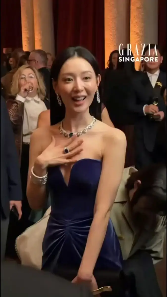 金智媛着宝蓝丝绒裙华贵温婉 抬手抚胸尽显迷人优雅