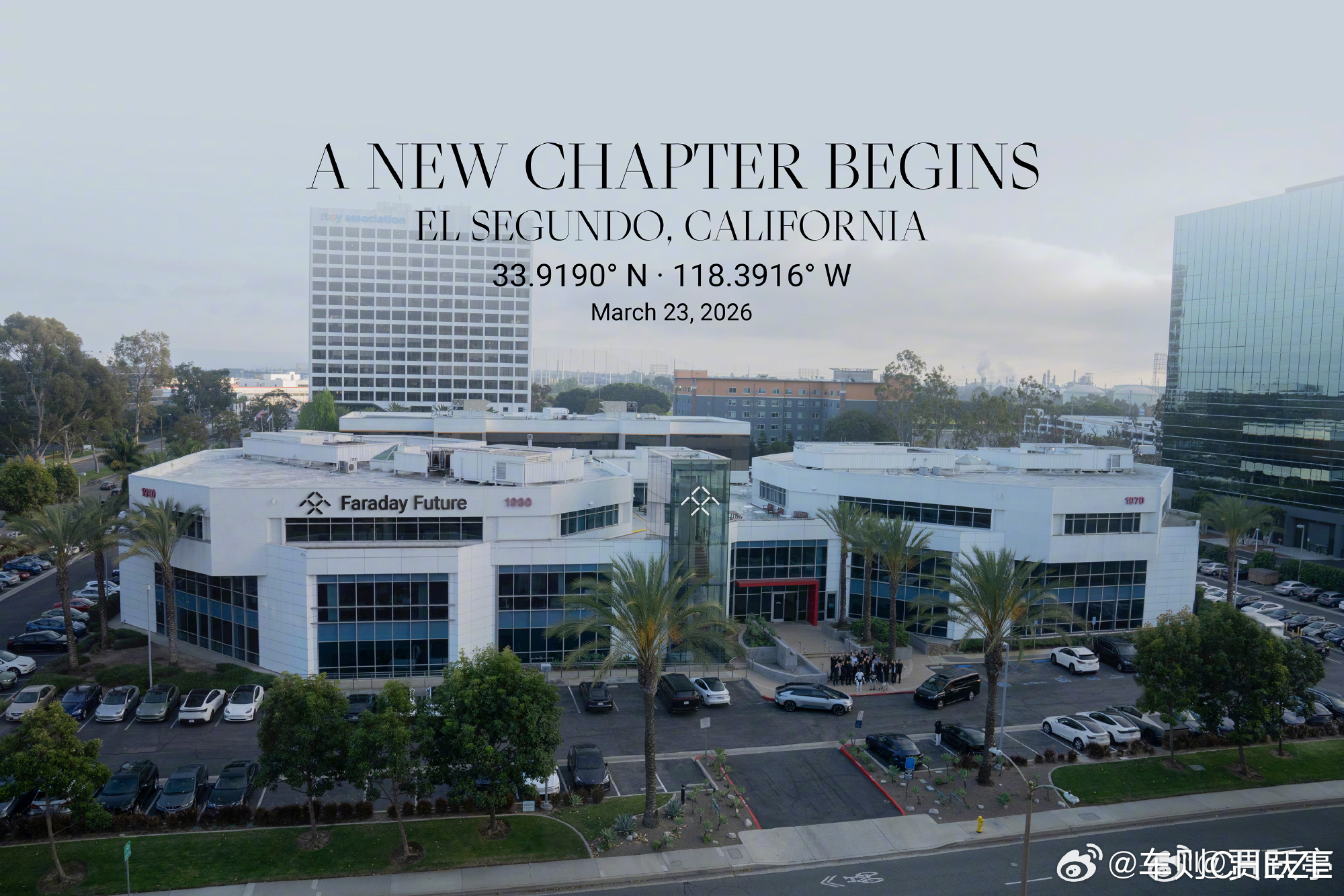 最早提出的生态链的乐视恭喜贾总,新总部,新征程。历经12年,FF正式乔迁洛杉矶硅滩,开启发展新篇章。FF乔迁硅滩总部首日,高管团队合影留念。FFAIFaradayFuture