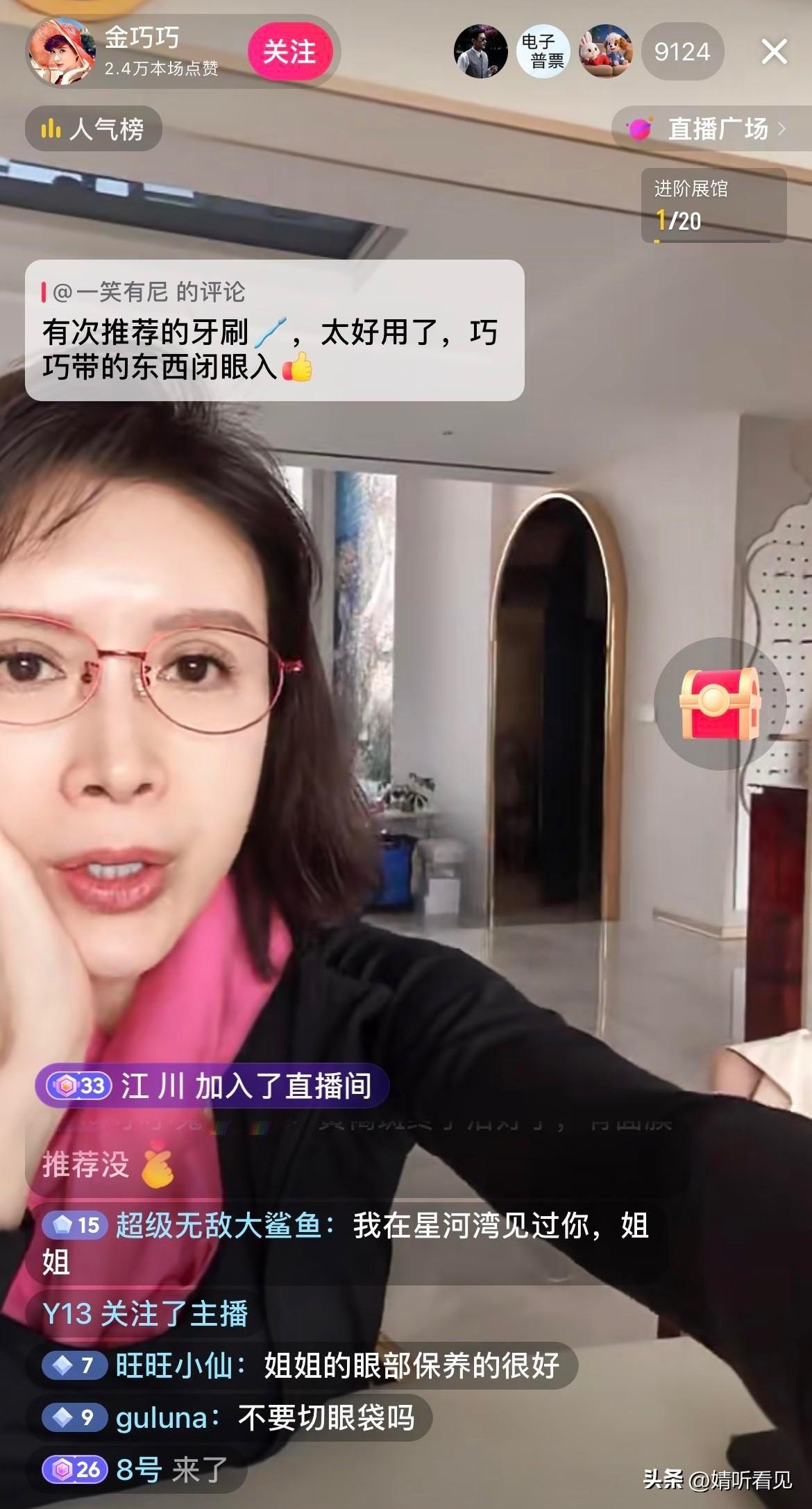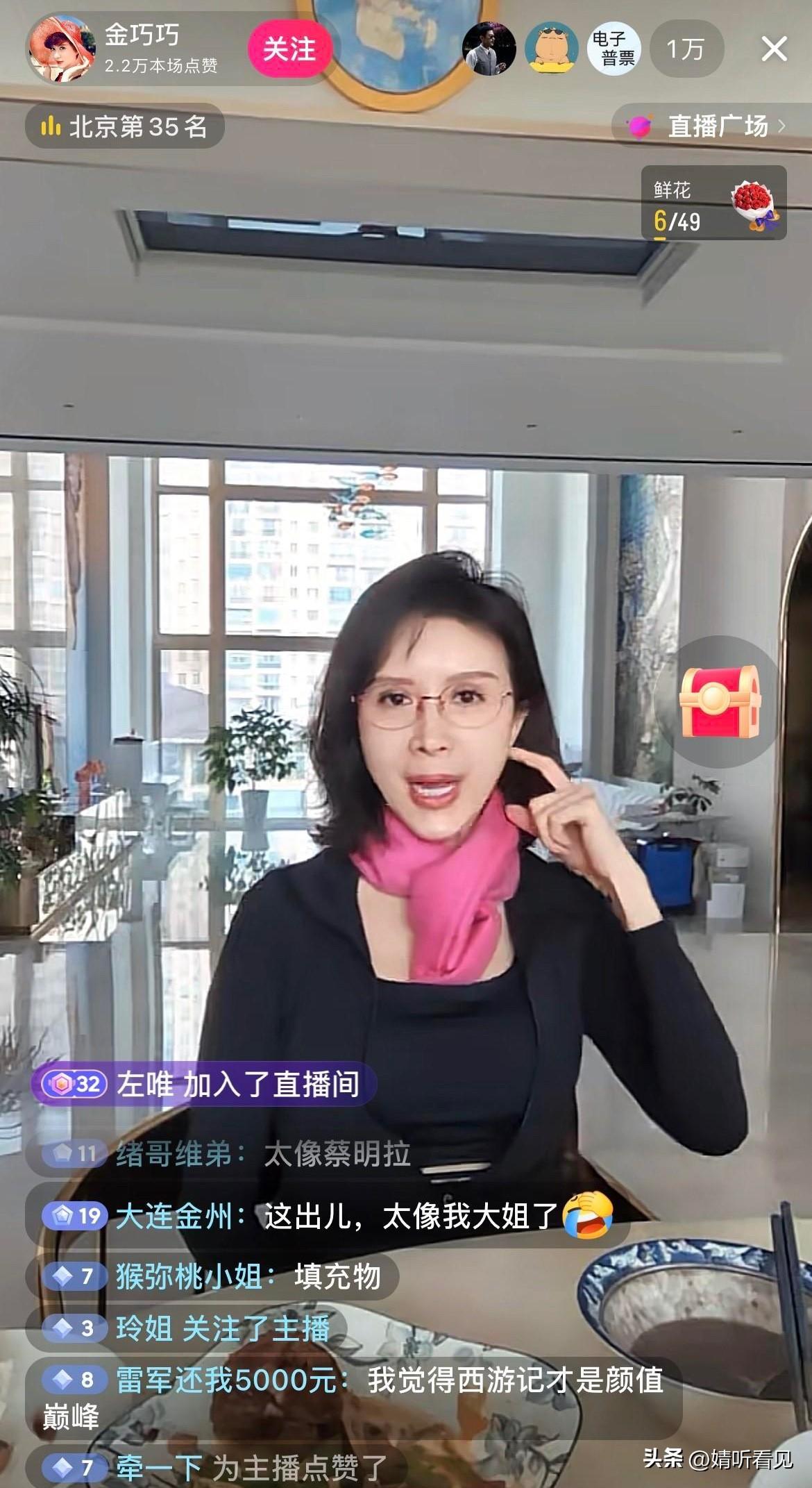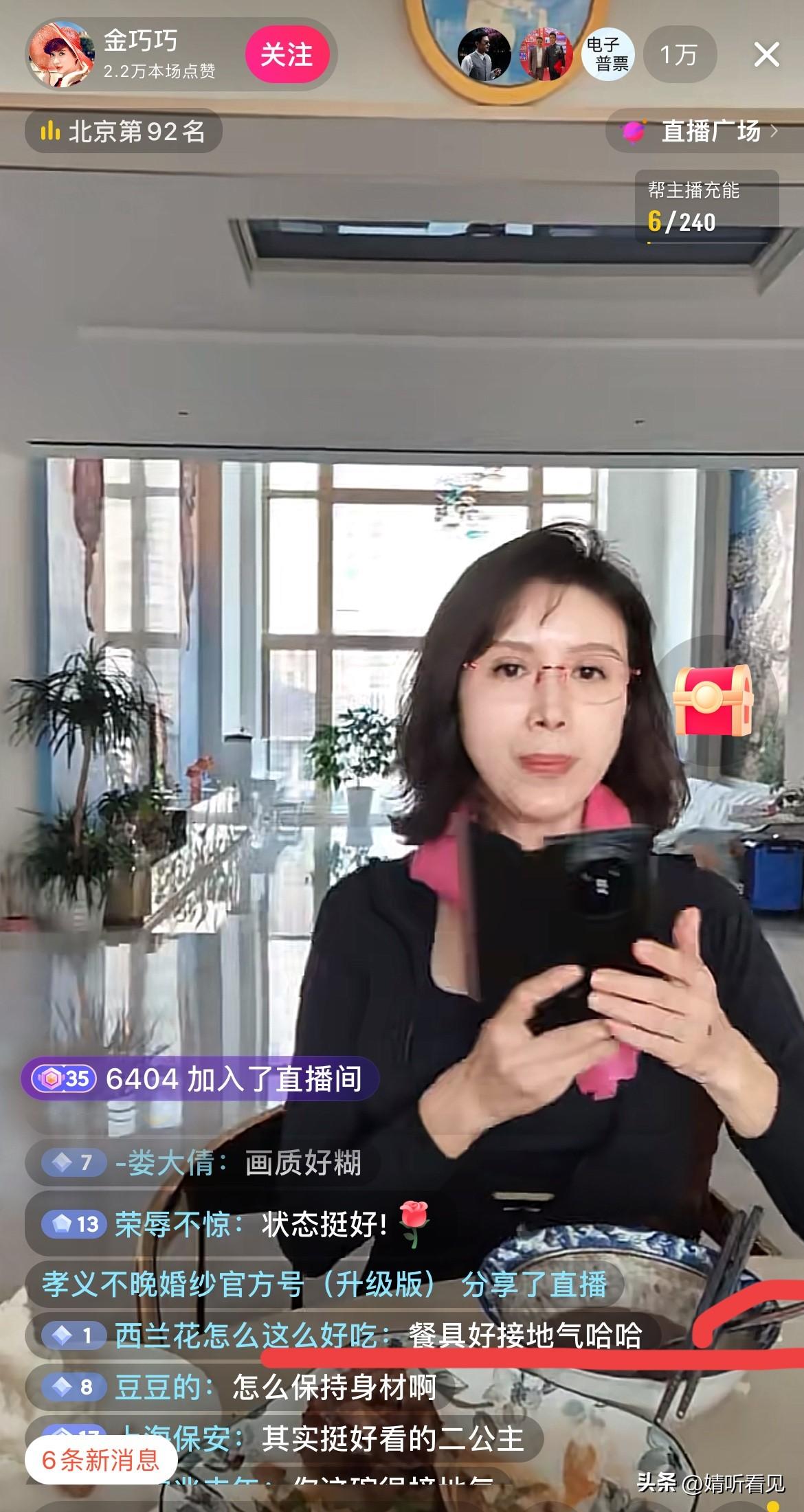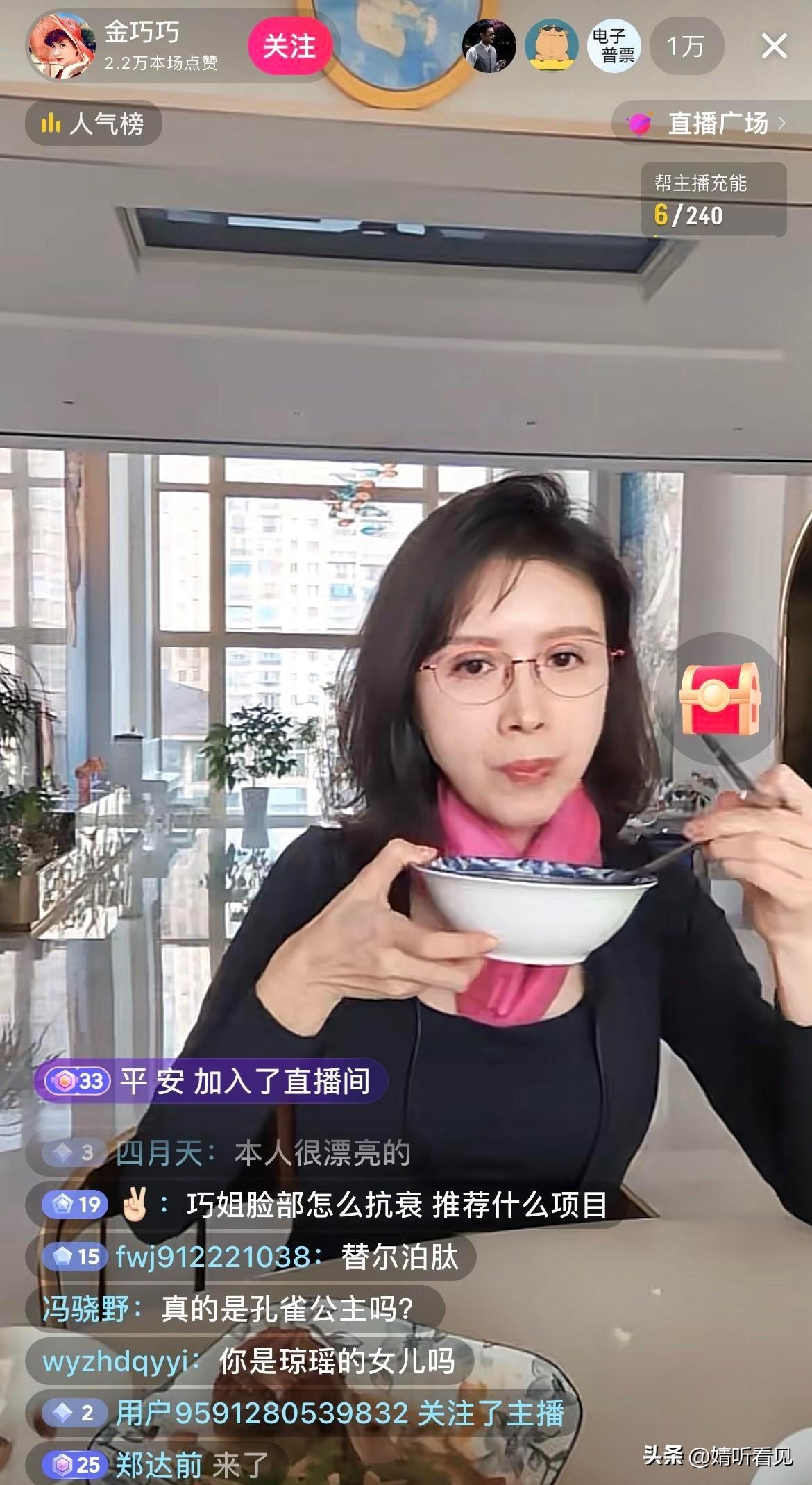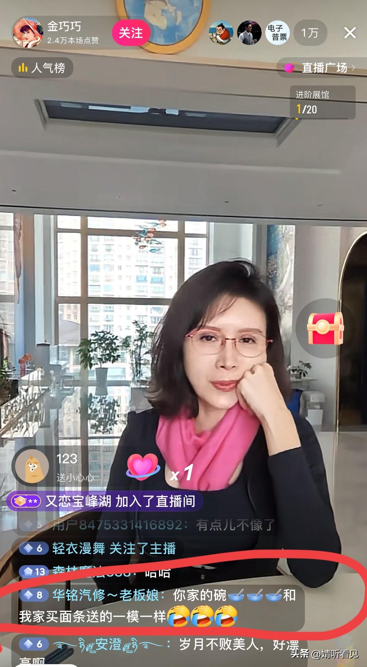 51岁的金巧巧,实在太逗啦! 3月24日中午直播时恰逢饭点,她所用的餐具格外抢镜。网友称这餐具很接地气,还有网友表示,这跟在她家买面条赠送的餐具碗一模一样。说实话,作为博纳的老板娘,家里用如此普通的餐具,着实令人意外。不过,有网友说曾在星河湾见过她,想来金巧巧也不太在意这些。 她还和网友分享了当初拍摄《西游记》时的经历。她觉得自己当时太瘦,上镜不好看,便在脸部做了填充。后来在剧中,能明显看到她脸上的苹果肌。可她又觉得效果不佳,过了几年就把填充消融,取消了填充。 她和网友聊起医美话题,网友纷纷向她请教。她还说自己以后不再做“寒号鸟”,带货是她的梦想,念叨了5年都没付诸行动,现在要行动起来,到时候会和大家分享她用过的好用产品。说完便匆匆下播,称要去弄她的睫毛了。