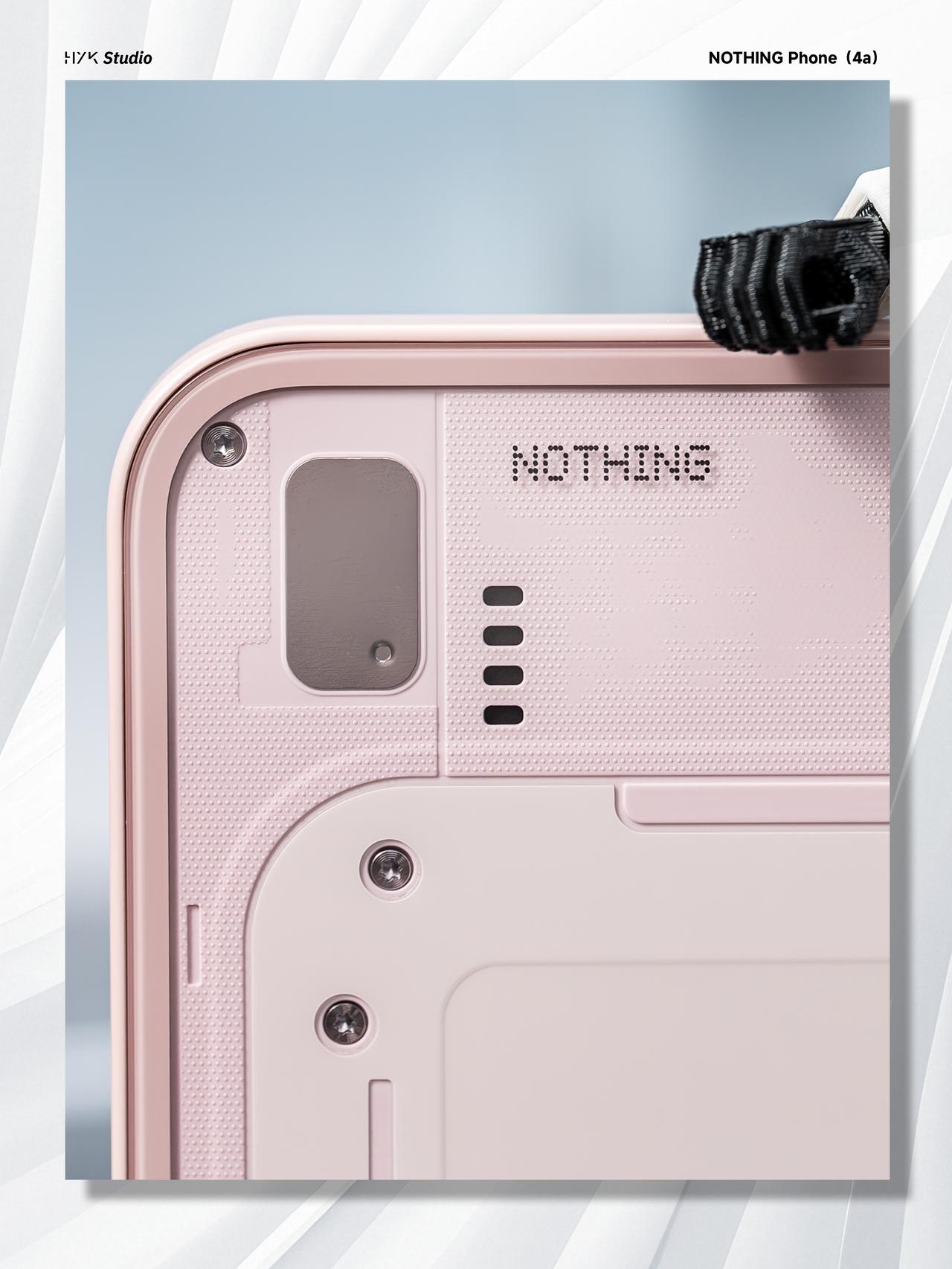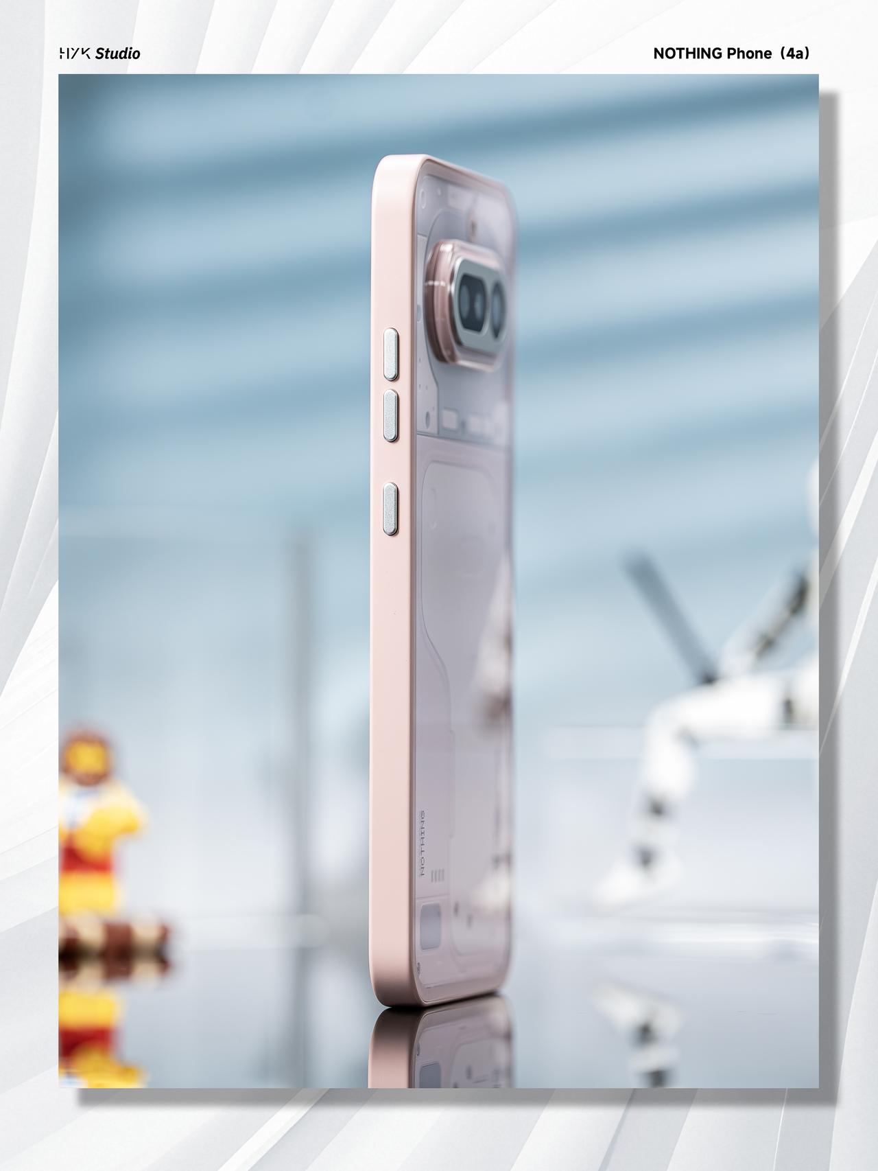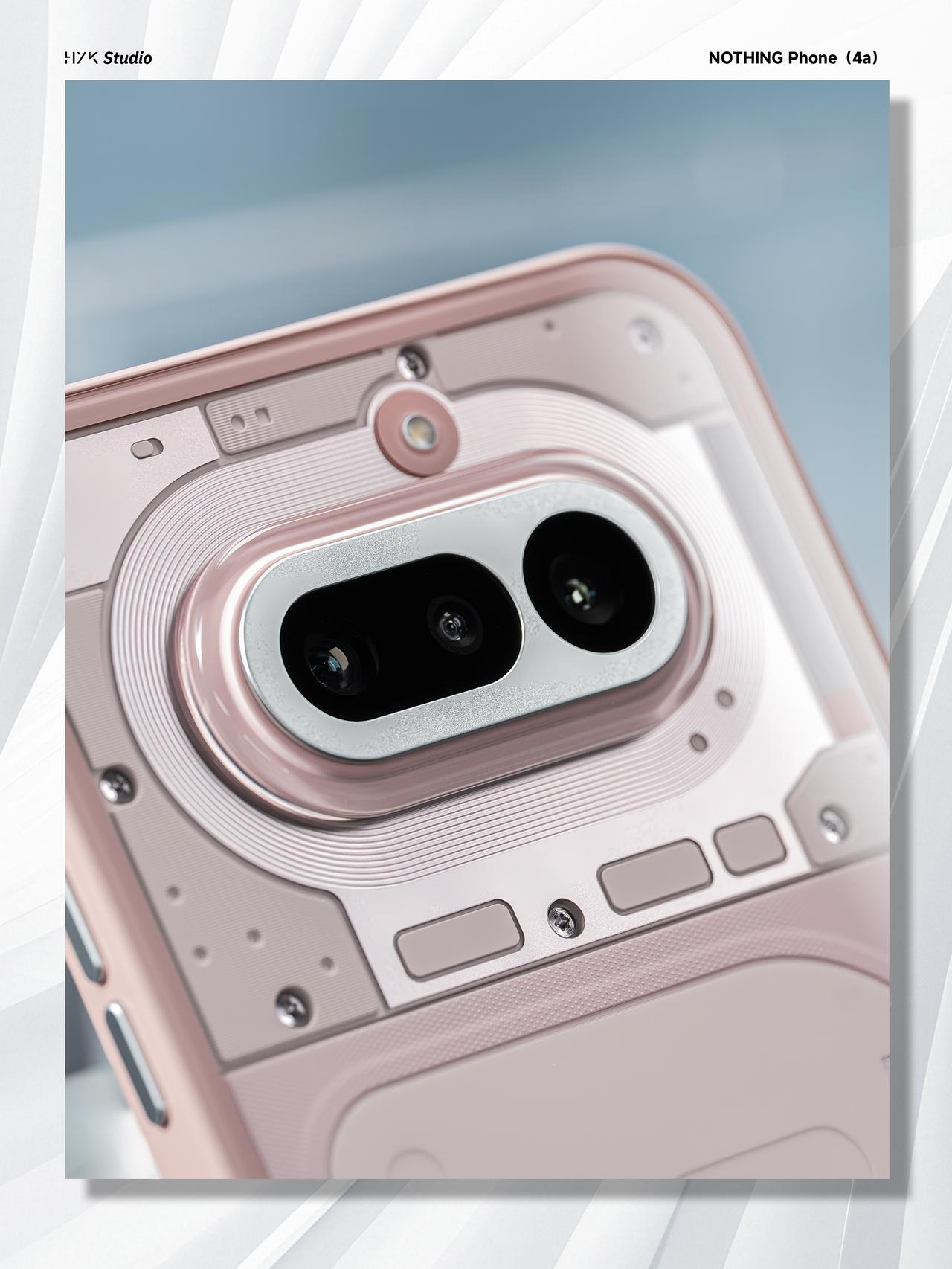 HYK图赏|Nothing Phone (4a) 后盖用的是全透明玻璃背板,右上角的 Glyph 灯带由前代的弧形线条改为7 个独立的方形格子,科技感十足。淡粉色的中框跟又与这种科技感形成反差,可以说是又甜又酷了。后置三摄用的是横向排列设计,机身侧边保留了标志性的Essential Key实体按键,总得来说,这台机器还是非常酷的。