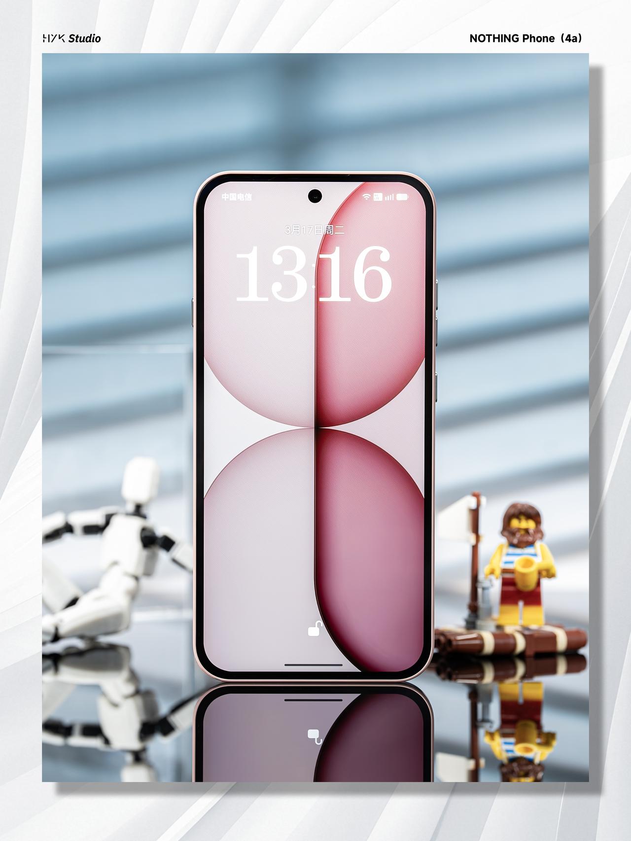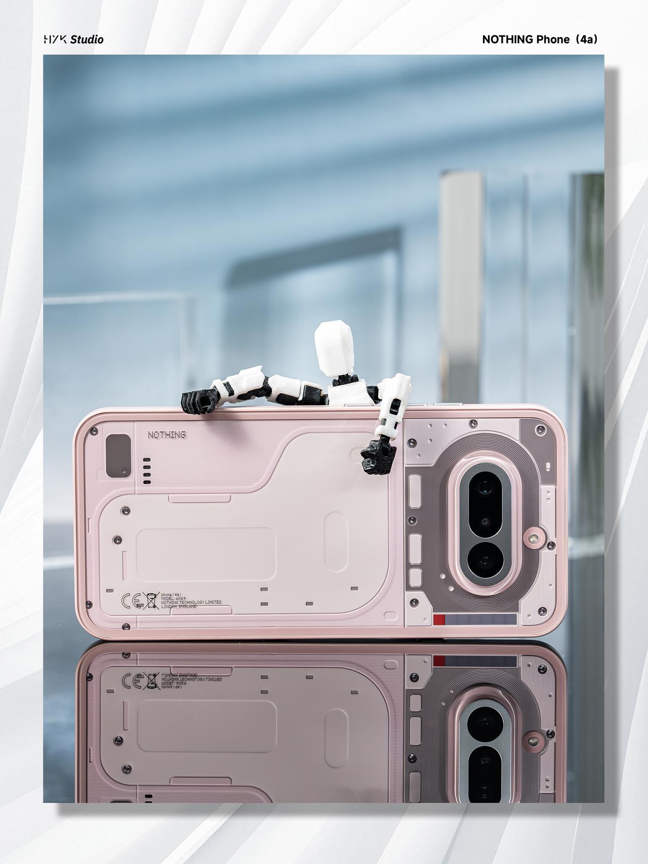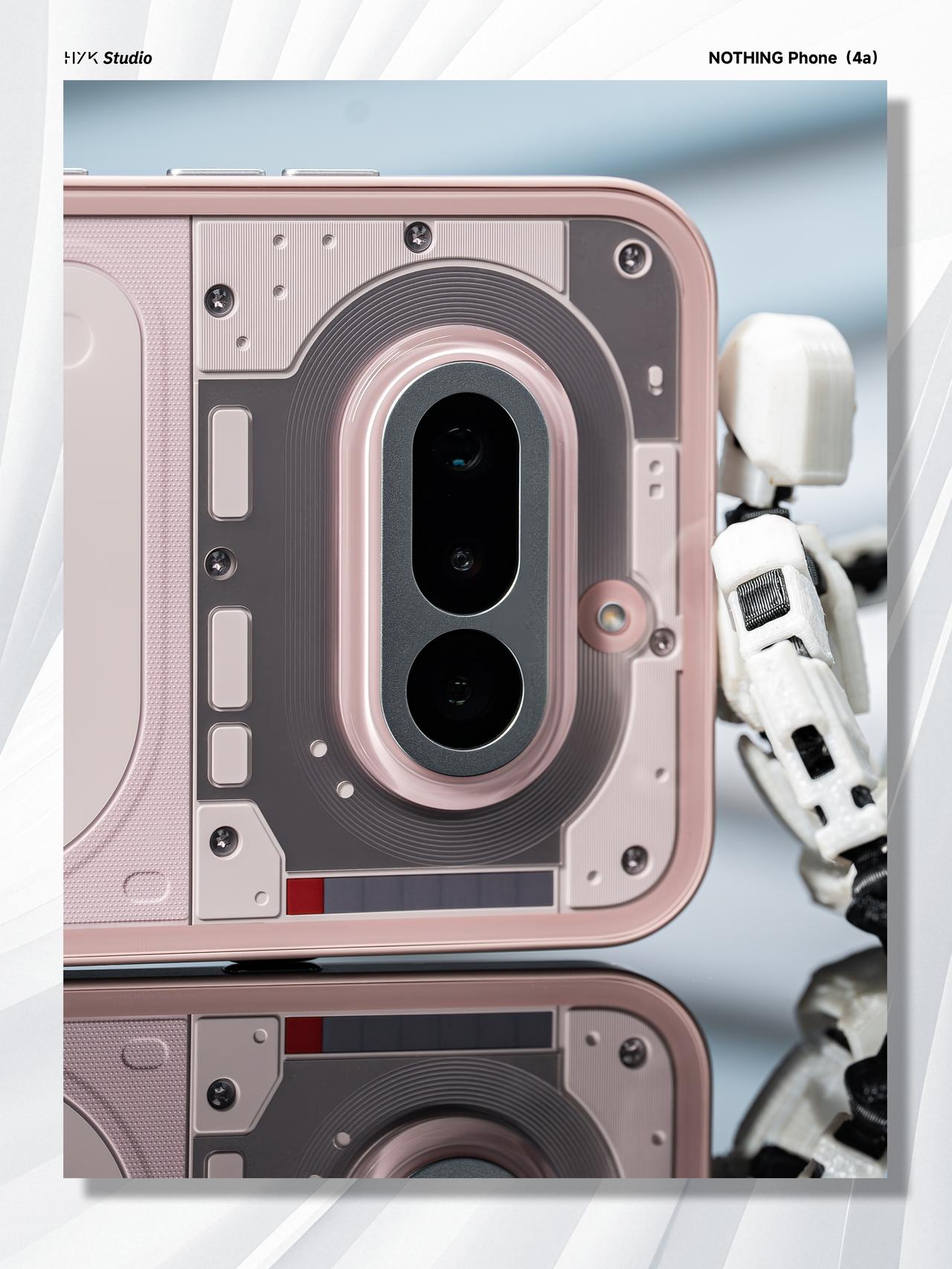 HYK图赏|Nothing Phone (4a) 后盖用的是全透明玻璃背板,右上角的 Glyph 灯带由前代的弧形线条改为7 个独立的方形格子,科技感十足。淡粉色的中框跟又与这种科技感形成反差,可以说是又甜又酷了。后置三摄用的是横向排列设计,机身侧边保留了标志性的Essential Key实体按键,总得来说,这台机器还是非常酷的。