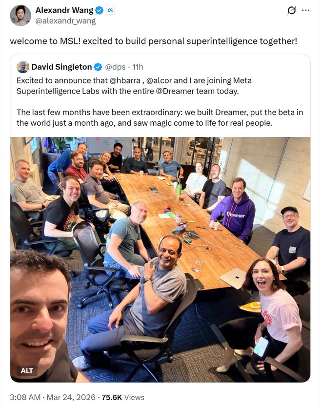 智东西3月24日消息,Meta首席AI官亚历山大·王(AlexandrWang)今日在社交媒体X平台宣布,Meta已将AI智能体初创公司Dreamer的创始团队以“收购式招聘”的方式悉数揽入旗下超级智能实验室,共同推进AI智能体及相关项目研发。据彭博社报道,知情人士透露,Dreamer仍作为独立法律实体存在,Meta获得使用Dreamer技术的非独家许可。Wang也是Dreamer的个人投资方。