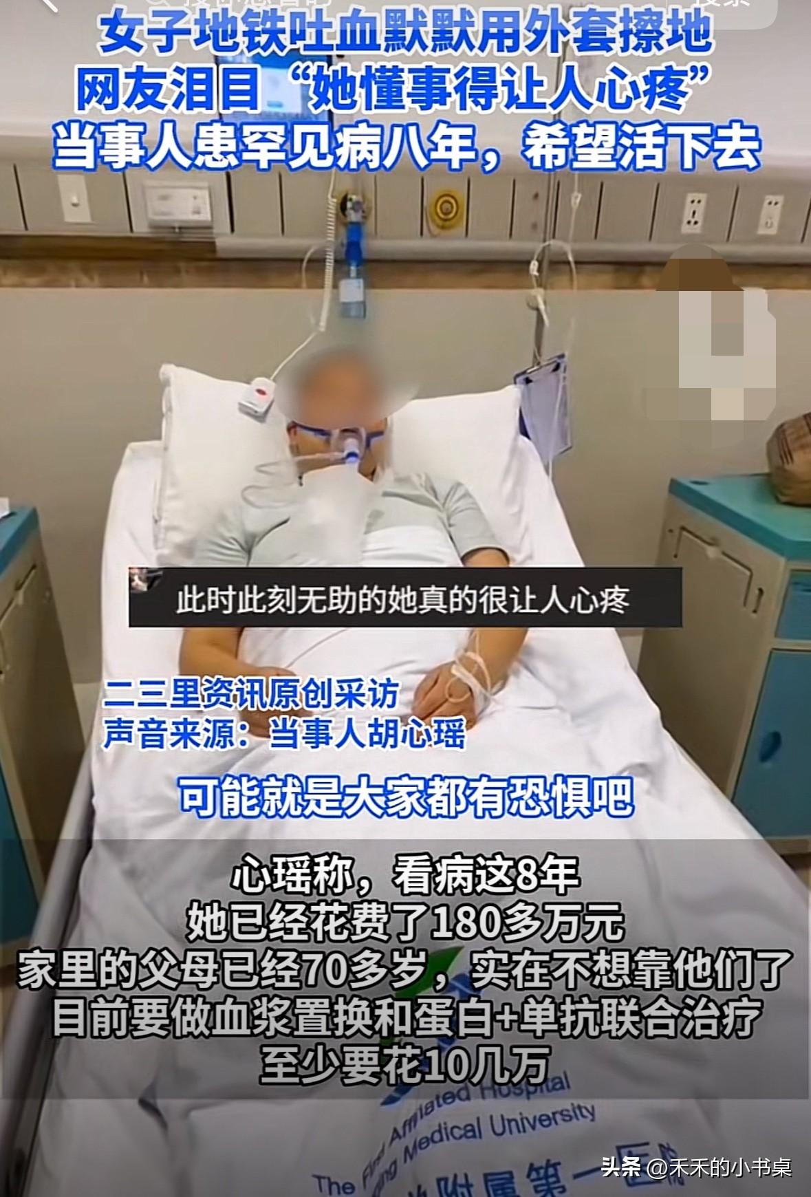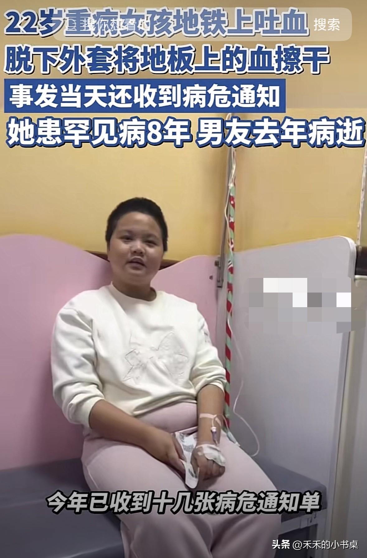在重庆地铁上,女子突然口吐鲜血,女子怕踩脏别人的鞋子,于是脱下外套,用外套擦干净地板。 据了解,女子八年前患了罕见病,期间已经花费了180多万。 女子因为重病,拒绝了男朋友两次求婚,没想到男友去年因重病先她离世。 男友临终前还托人转五万元为女子治病!真是有情有义。 事发当天女子还收到病危通知单,女子说:“父母都在老家,所有治病流程都是自己来做。” 命运专门挑细绳下手,真是太可怜了。 真是好人不长命,祸害遗千年。地铁