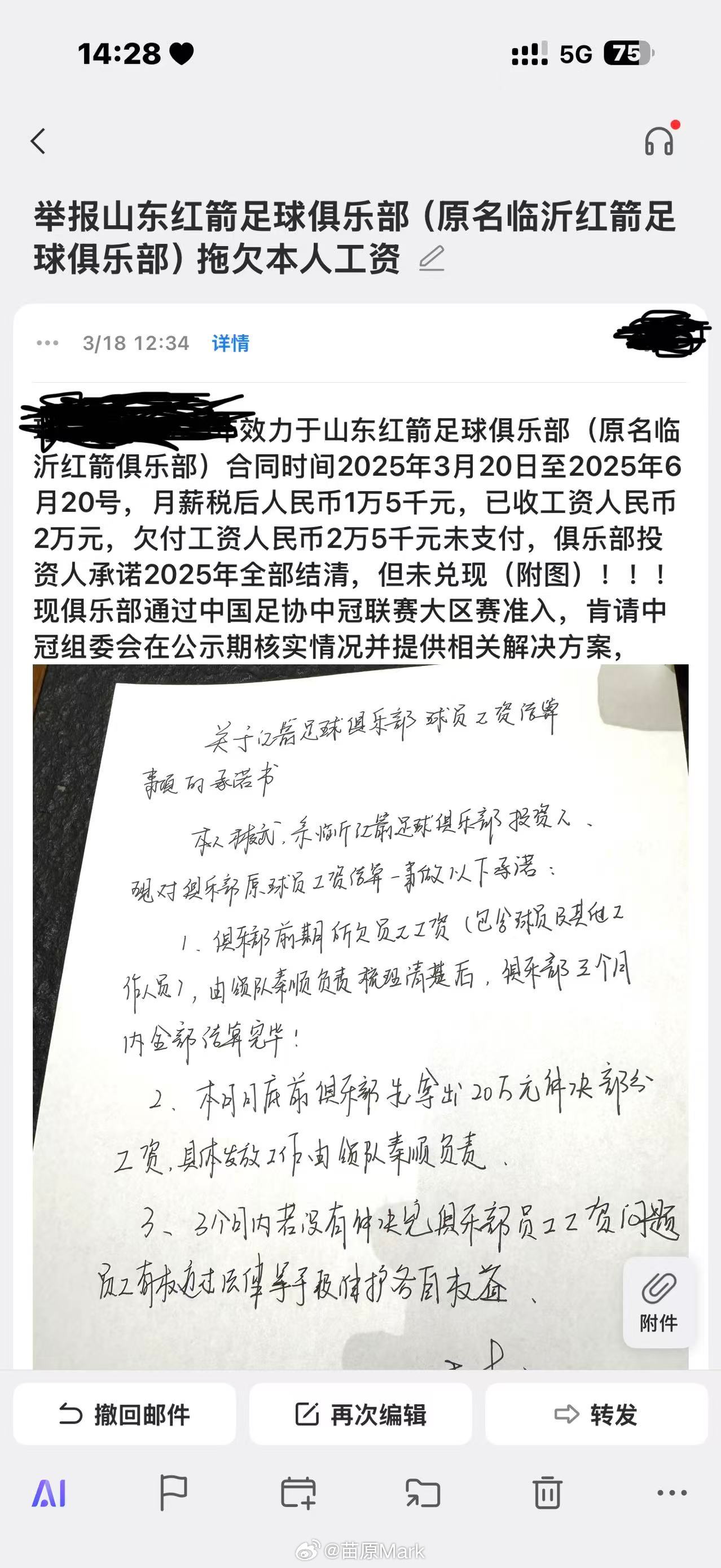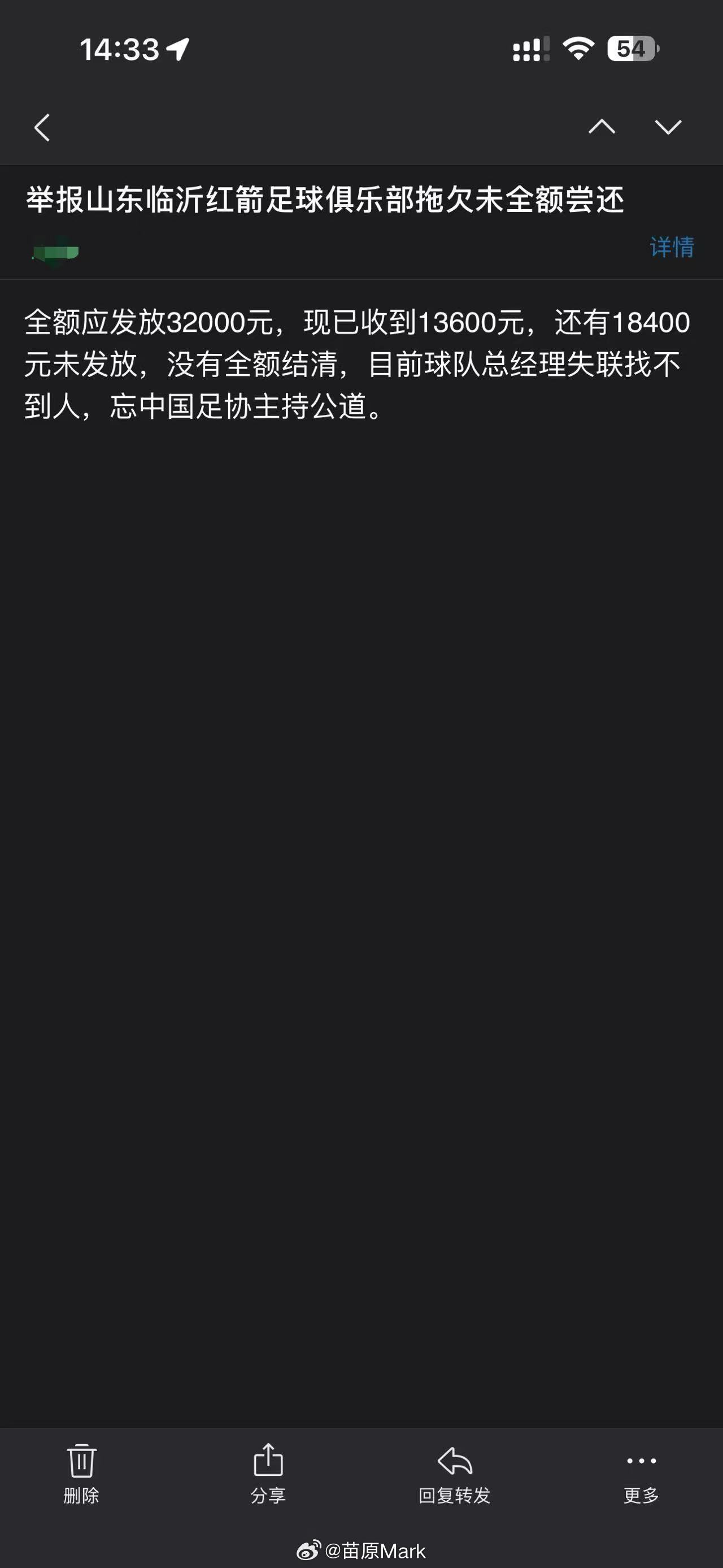 中冠联赛 山东红箭被举报欠薪,这家俱乐部今年中冠准入前就有纠纷,准入后球员反映问题没有全部解决,但拖到准入后再去追欠款就比较难了,类似情况在四级联赛很多,一般只能再去等仲裁,时间和精力的成本非常大,就算一直和足协、俱乐部沟通,也不一定能拿回所有的钱。