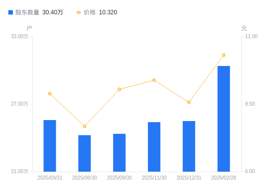 日期A股户数(户)流通A股户均持股数(股)户均持股市值(万元)2026-02-2830402113288.6913.712025-12-3125500015843.2913.582025-11-3025400015905.6714.942025-09-3024364816581.4615.012025-06-3024240816666.2812.802025-03-3125583215791.6714.042024-12-3127540914669.1413.012024-09-3026624015174.5015.722024-06-3028010014423.6312.102024-03-3127973614441.1916.72
