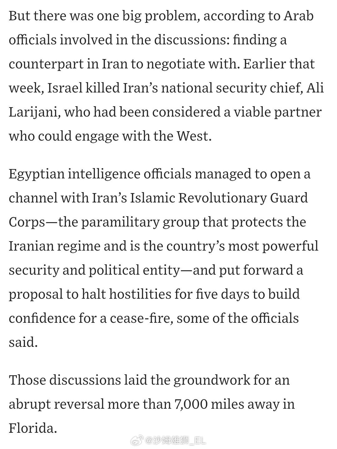 西方只能通过埃及情报部门的秘密通道才能与伊朗取得联系,特朗普还显摆个屁 WSJ报道称,在暗杀阿里·拉里贾尼后,爱泼斯坦联军发现自己已经无法与伊朗建立谈判和对话通道,因为之前负责谈判的就是拉里贾尼。但埃及情报部门近期设法与伊朗革命卫队建立了秘密联系渠道,并转交了关于停火五天的倡议。该报称,因为埃及这条线的建立,特朗普3月23日才会发帖声称放弃袭击伊朗能源设施的计划并寻求谈判,就这脆弱的不能再脆弱的联系也值得拿出来显摆。此外,伊朗法尔斯新闻通讯社证实,今天即3月24日埃及外交部长与伊朗外交部长进行了通话。