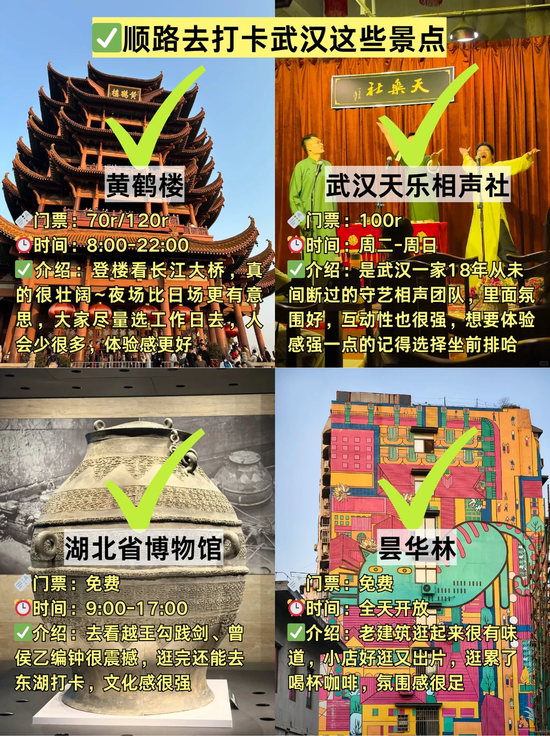 武汉烟火气天花板,吃过逛过就爱上。来武汉旅游,沉浸式感受街头美食与城市风景,武汉旅游攻略配齐全内容,武汉住宿推荐近2号线平价民宿,高性价比酒店也超好挑。武汉好玩的地方老少皆宜,情侣单人、亲子老人、学生党都有对应玩法,室内户外全覆盖,武汉江汉路、古德寺超有逛头。武汉美食直击味蕾,粮道街热干面、本地人推荐必吃榜、武汉漂亮饭香到上头,可带走特产方便邮寄。武汉拍照出片地超多,黄鹤楼汉服妆造、古德寺打卡点、长江大桥机位随手拍大片。武汉天乐相声社超级值得体验,选座全、座位宽、带娃适配,真的巨好看有必要去!
