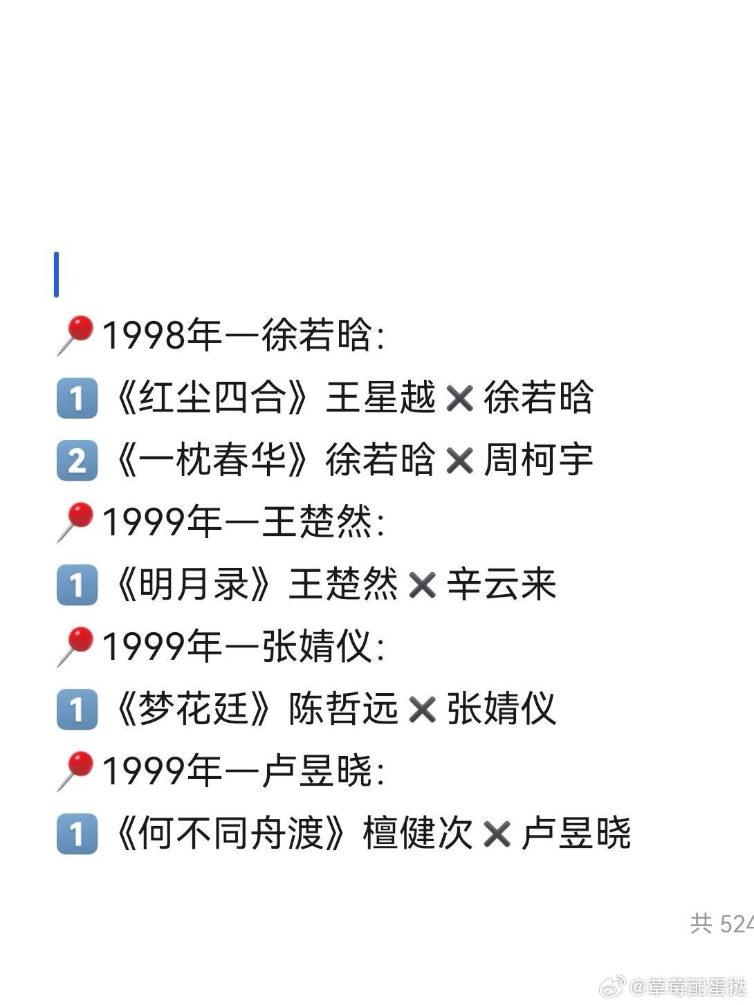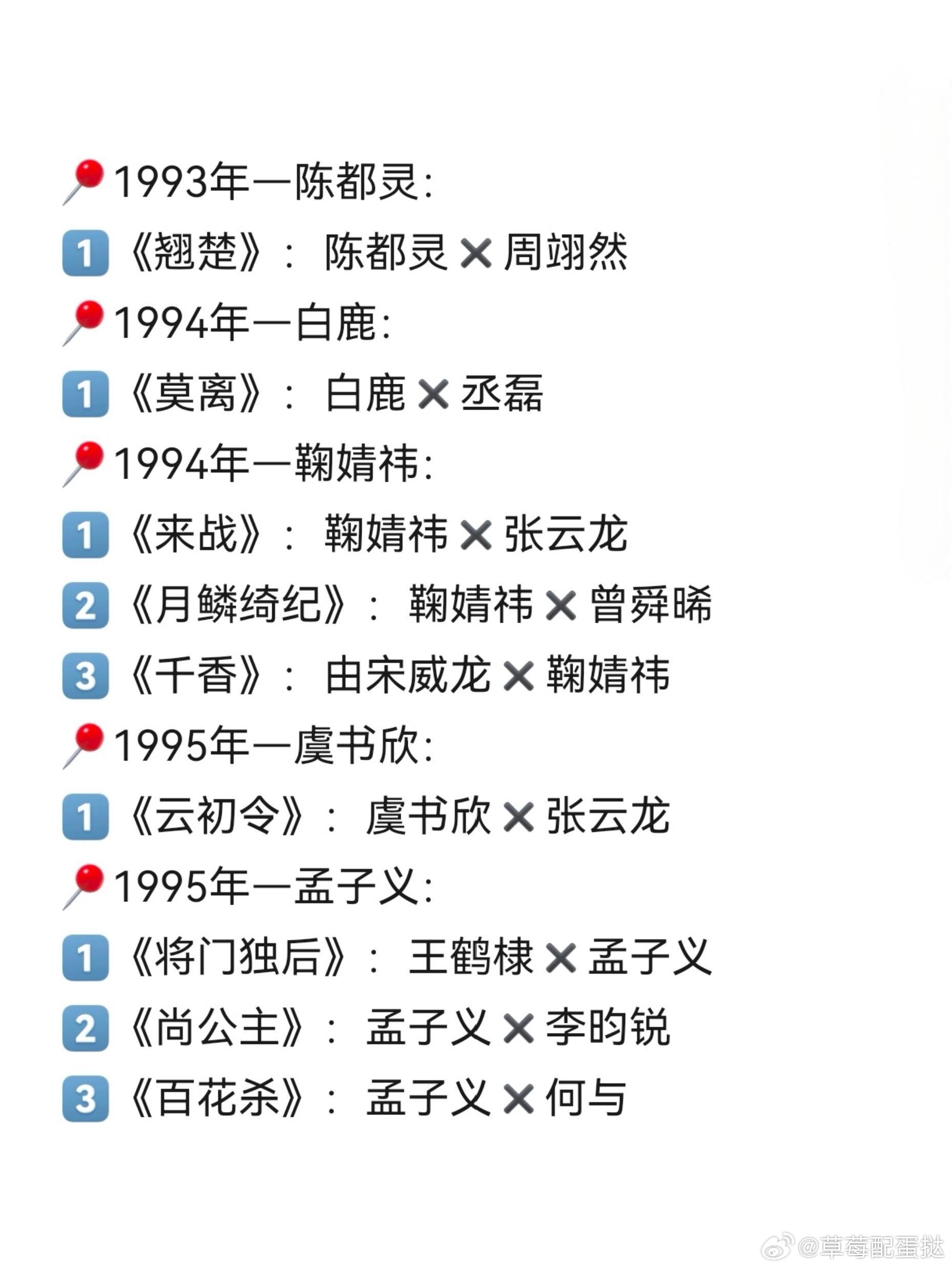 90后小花2026年待播古偶‼️盘点2026年,90后小花待播古偶剧,你最期待哪一部呢?1993年—陈都灵:1️⃣《翘楚》:陈都灵✖️周翊然1994年—白鹿:1️⃣《莫离》:白鹿✖️丞磊1994年—鞠婧祎:1️⃣《来战》:鞠婧祎✖️张云龙2️⃣《月鳞绮纪》:鞠婧祎✖️曾舜晞3️⃣《千香》:由宋威龙✖️鞠婧祎1995年—虞书欣:1️⃣《云初令》:虞书欣✖️张云龙1995年—孟子义:1️⃣《将门独后》:王鹤棣✖️孟子义2️⃣《尚公主》:孟子义✖️李昀锐3️⃣《百花杀》:孟子义✖️何与1996年—章若楠:1️⃣《雨霖铃》:杨洋✖️章若楠1996年—林允:1️⃣《归鸾》:张凌赫✖️林允1997年—田曦薇:1️⃣《嫁金钗》:田曦薇✖️闫桉1997年—王玉雯:1️⃣《白衣公卿》:龚俊✖️王玉雯1998年—周也:1️⃣《一瓯春》:许凯✖️周也1998年—宋祖儿:1️⃣《表妹万福》:宋祖儿✖️陈鑫海2️⃣《司宫令》:丁禹兮✖️宋祖儿1998年—徐若晗:1️⃣《红尘四合》王星越✖️徐若晗2️⃣《一枕春华》徐若晗✖️周柯宇1999年—王楚然:1️⃣《明月录》王楚然✖️辛云来1999年—张婧仪:1️⃣《梦花廷》陈哲远✖️张婧仪1999年—卢昱晓:1️⃣《何不同舟渡》檀健次✖️卢昱晓