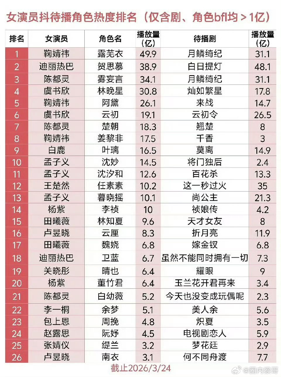 鞠婧祎《月鳞绮纪》的露芜衣抖话题播放量正式突破50亿大关,依旧是抖待播剧女角色热
