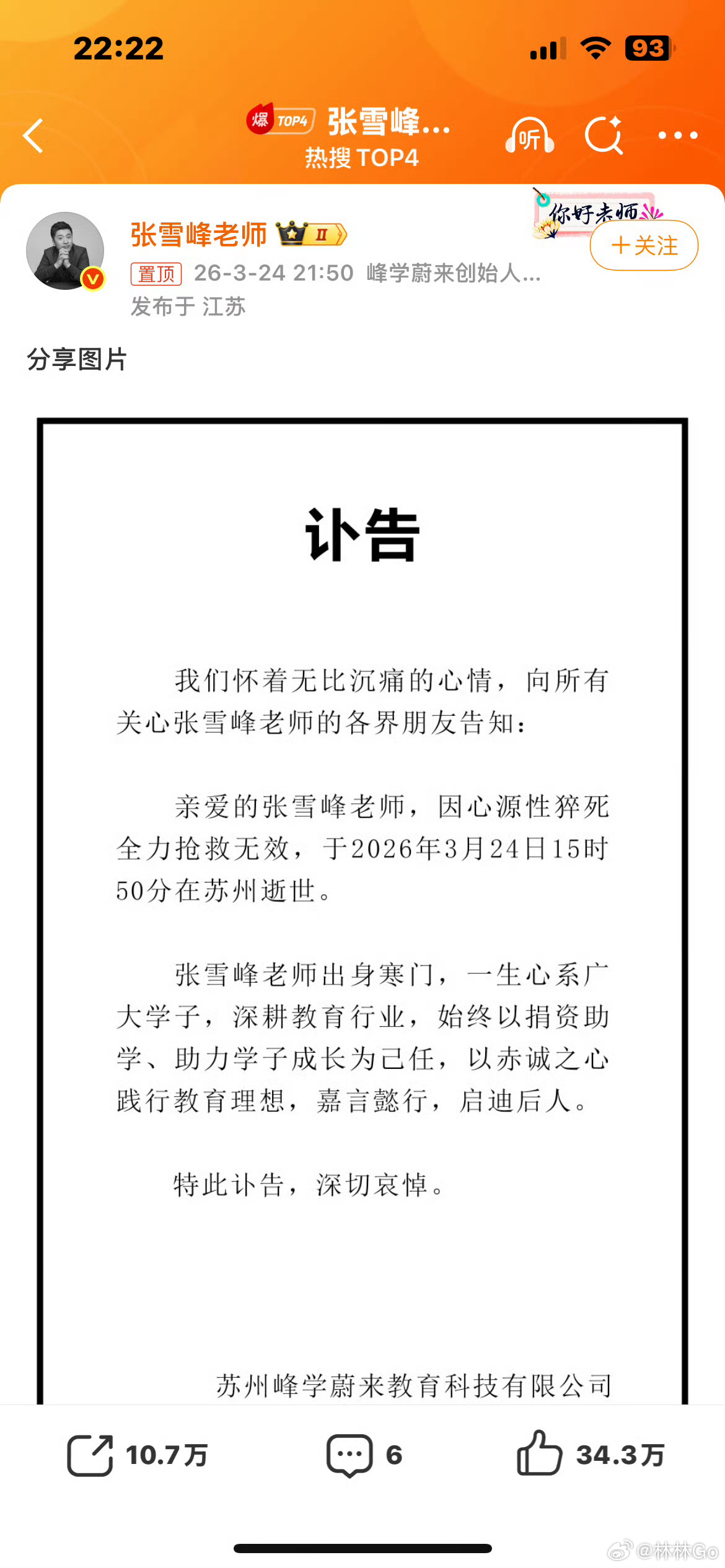我们家那位很震惊,他一直说张雪峰是个有良知的性情中人。才41岁,一路走好。张雪峰公司发布讣告