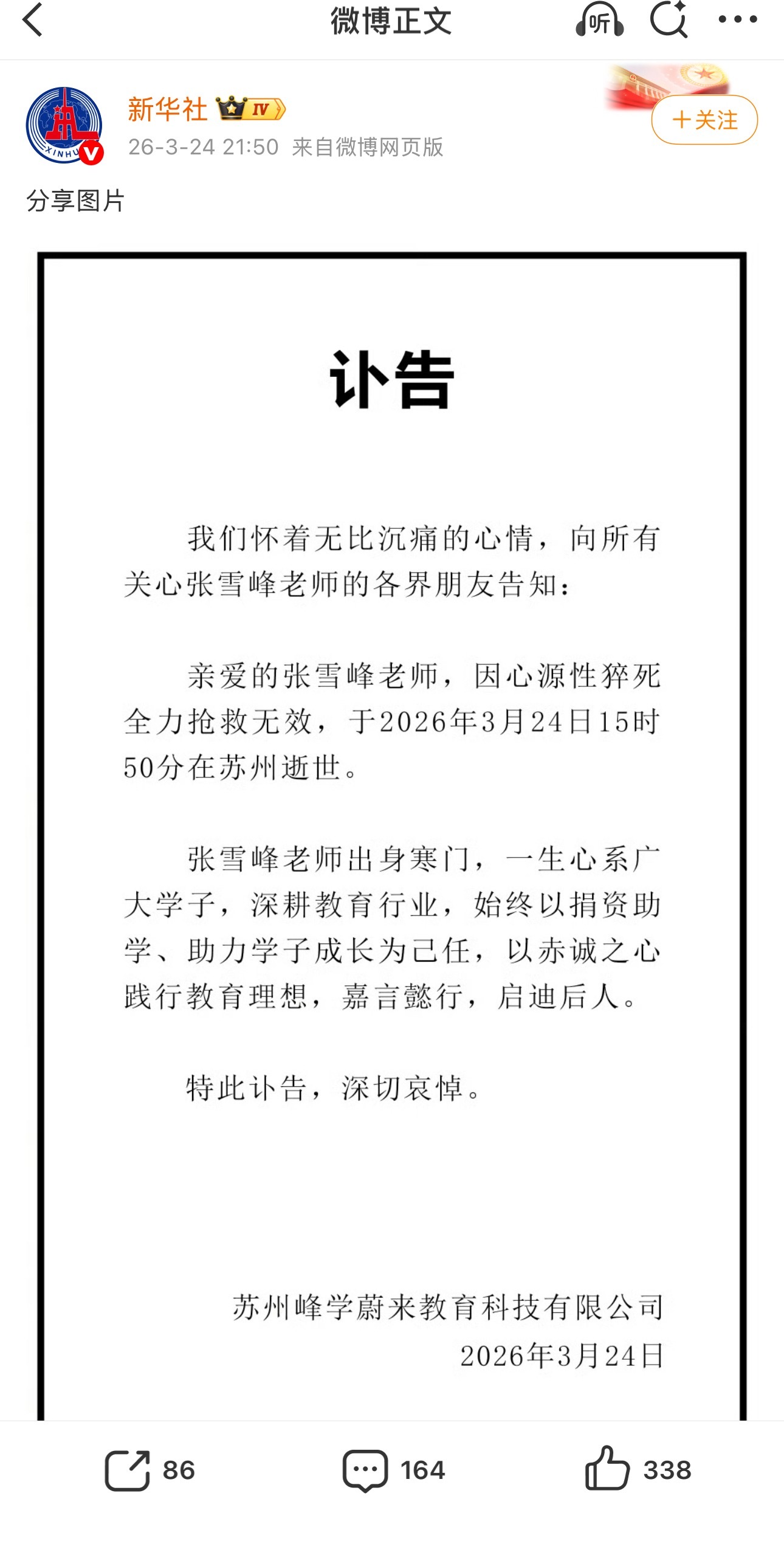 张雪峰公司发布讣告震惊!不敢相信!注意健康,健康才是第一。